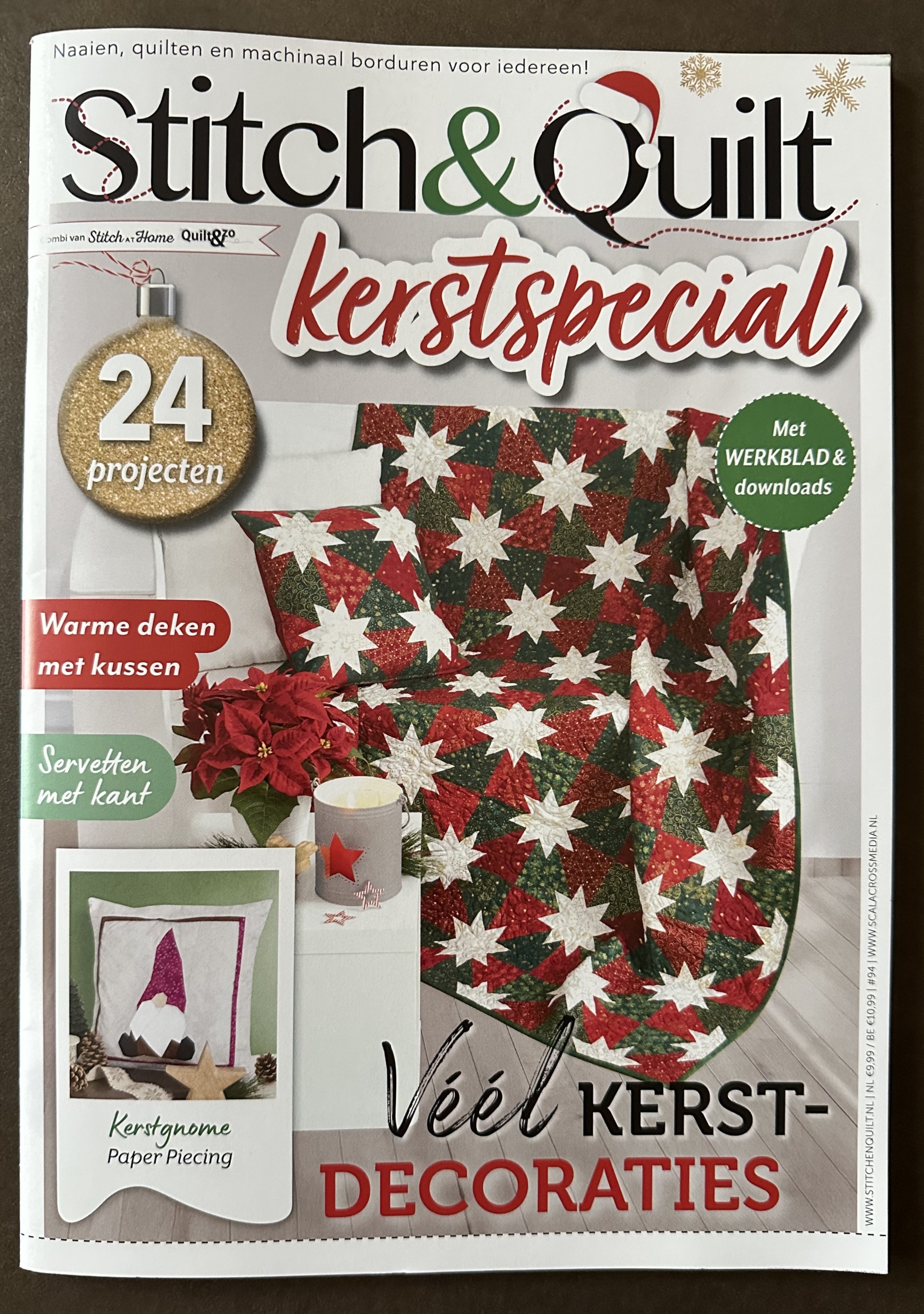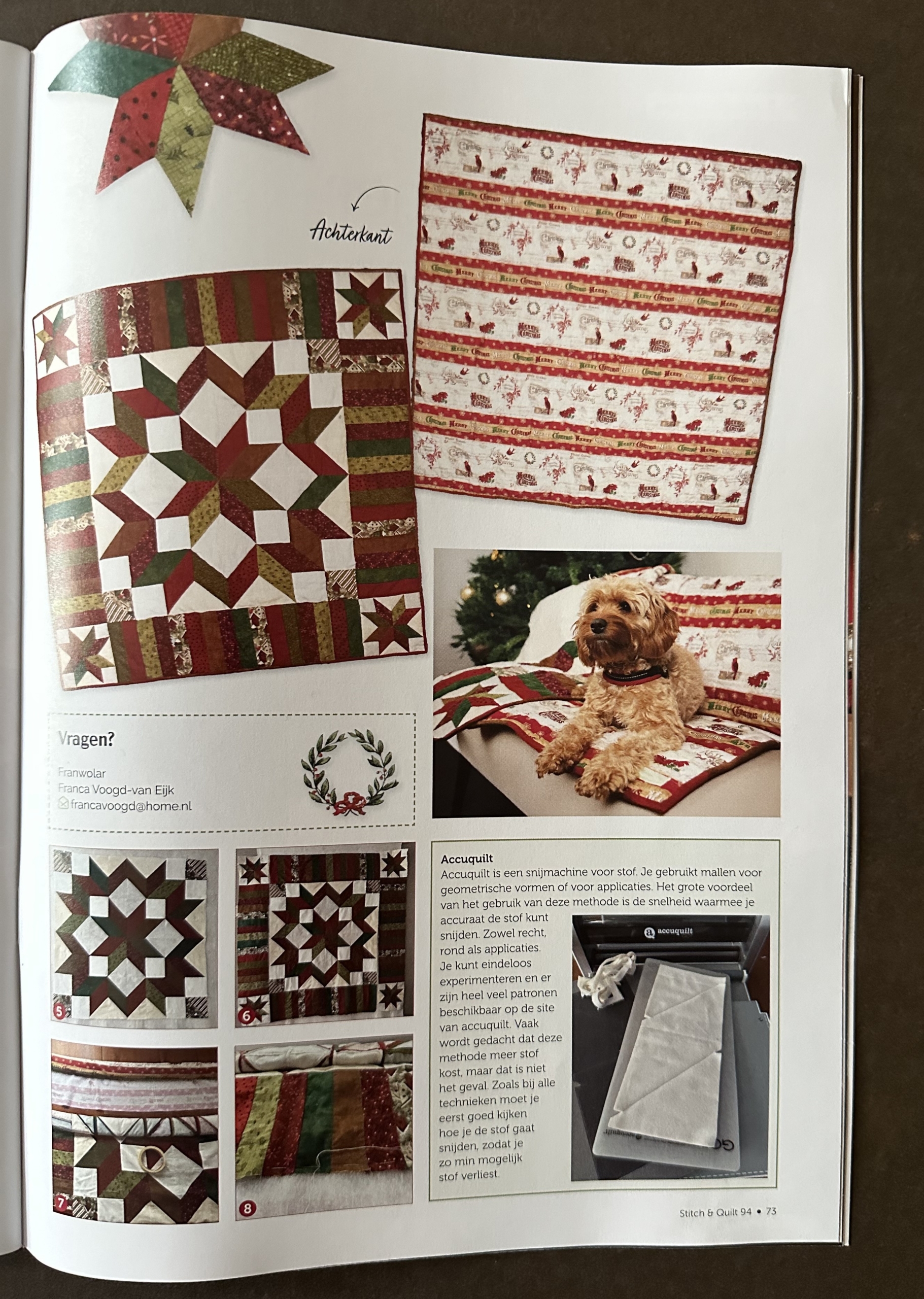 De meesten van ons kennen vast het magazine Stitch en Quilt. Voor deze kerst editie mocht Franca een patroon ontwerpen met behulp van de Accquilt. Een spannend proces en het was even flink doorwerken vertelde ze om alles op tijd af te krijgen. Ben je ook benieuwd naar deze quilt, of wil je meer weten over het gebruik van de Accuquilt, stuur Franca eens een berichtje, ze vertelt er graag van alles over. En koop natuurlijk deze editie van het magazine als je dat nog niet gedaan hebt.
