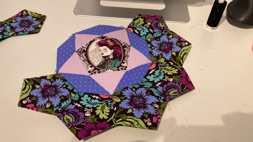 Voor de maand oktober kozen we de pentagon, voor mij toch een vorm die past bij deze maand als je denkt aan Halloween. Ik wilde dan voor mijn pentagonnen ook in dat thema blijven, en het was de perfecte maand om eindelijk in die stofjes van Tula Pink te snijden die al (te) lang mooi stonden te wezen in mijn kast. De twist voor deze maand is fussy cutting, een manier van snijden waarbij je specifieke plaatjes uit de stof snijdt ipv zo zuinig mogelijk.