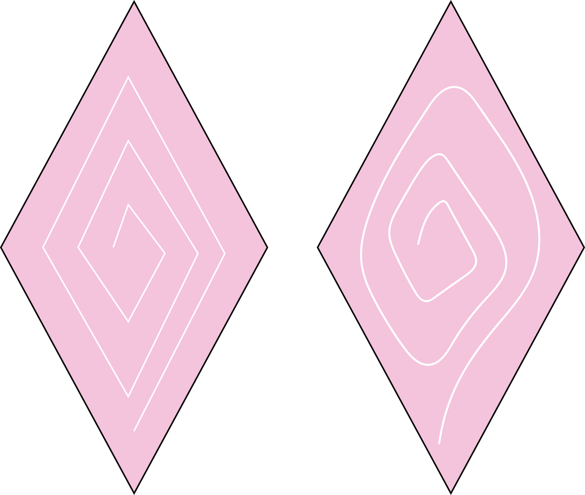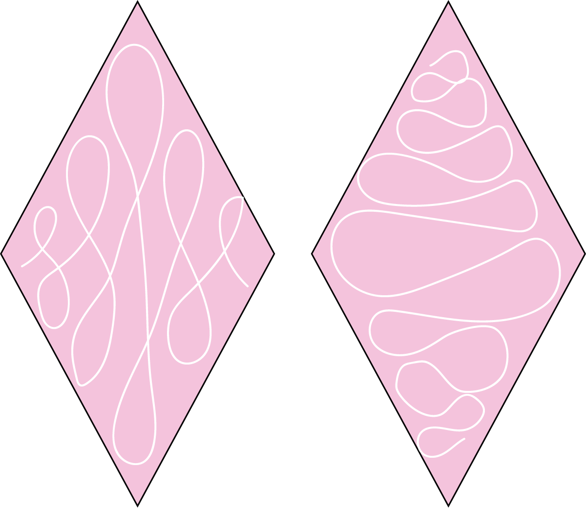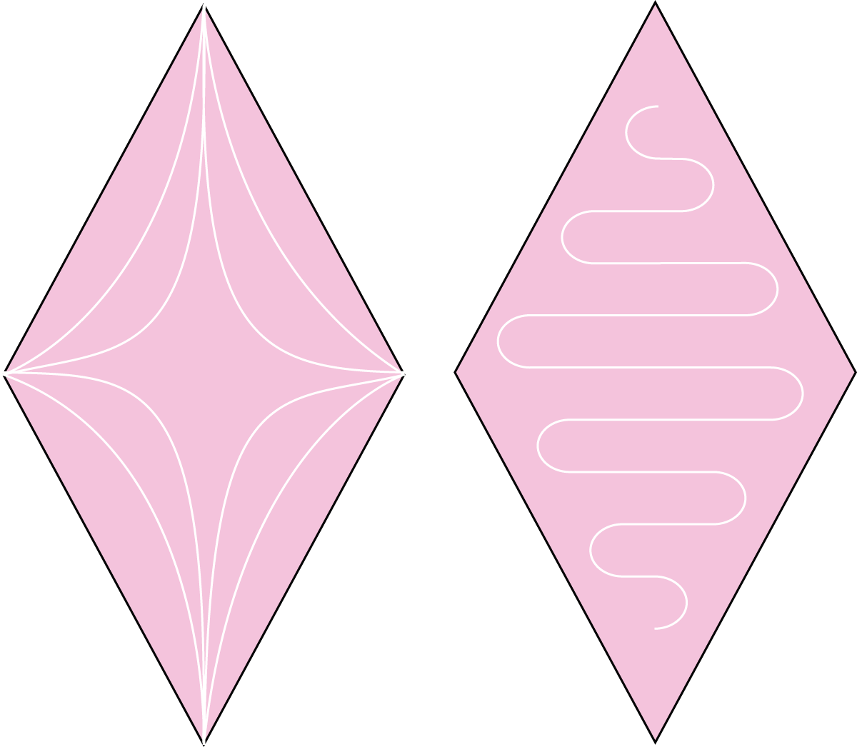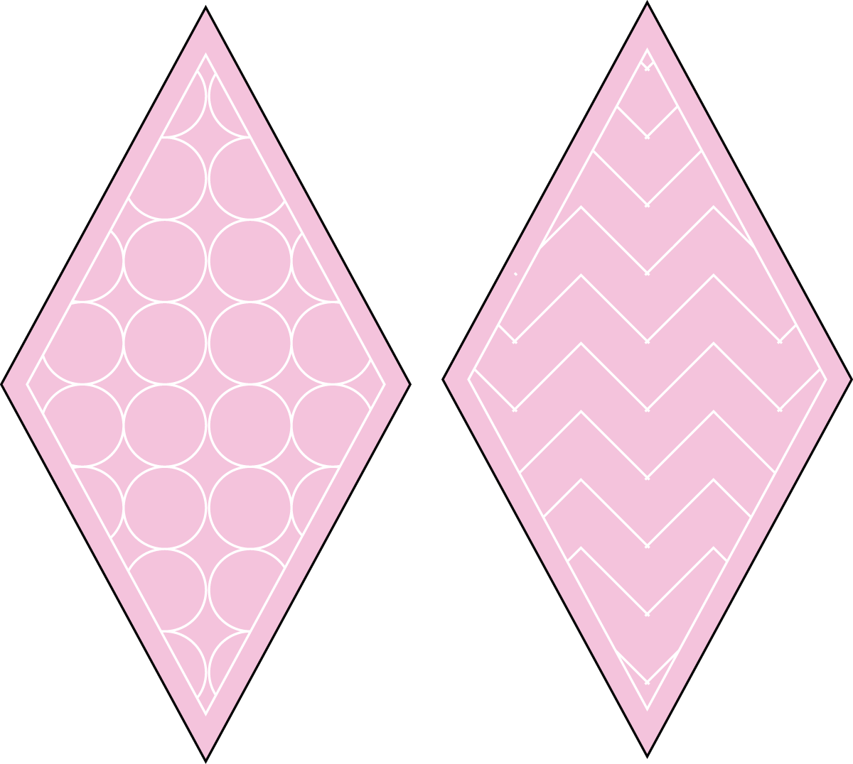 Een andere optie is het gebruiken van quilt linialen en daar een leuk patroon mee maken om de ruit op te vullen. Je zou bijvoorbeeld grote cirkel linialen kunnen nemen om de ruit hieronder links te maken. Waarbij je alleen een klein stuk van de cirkel quilt van punt naar punt. Misschien nog beter als je ovalen linialen in je collectie hebt.