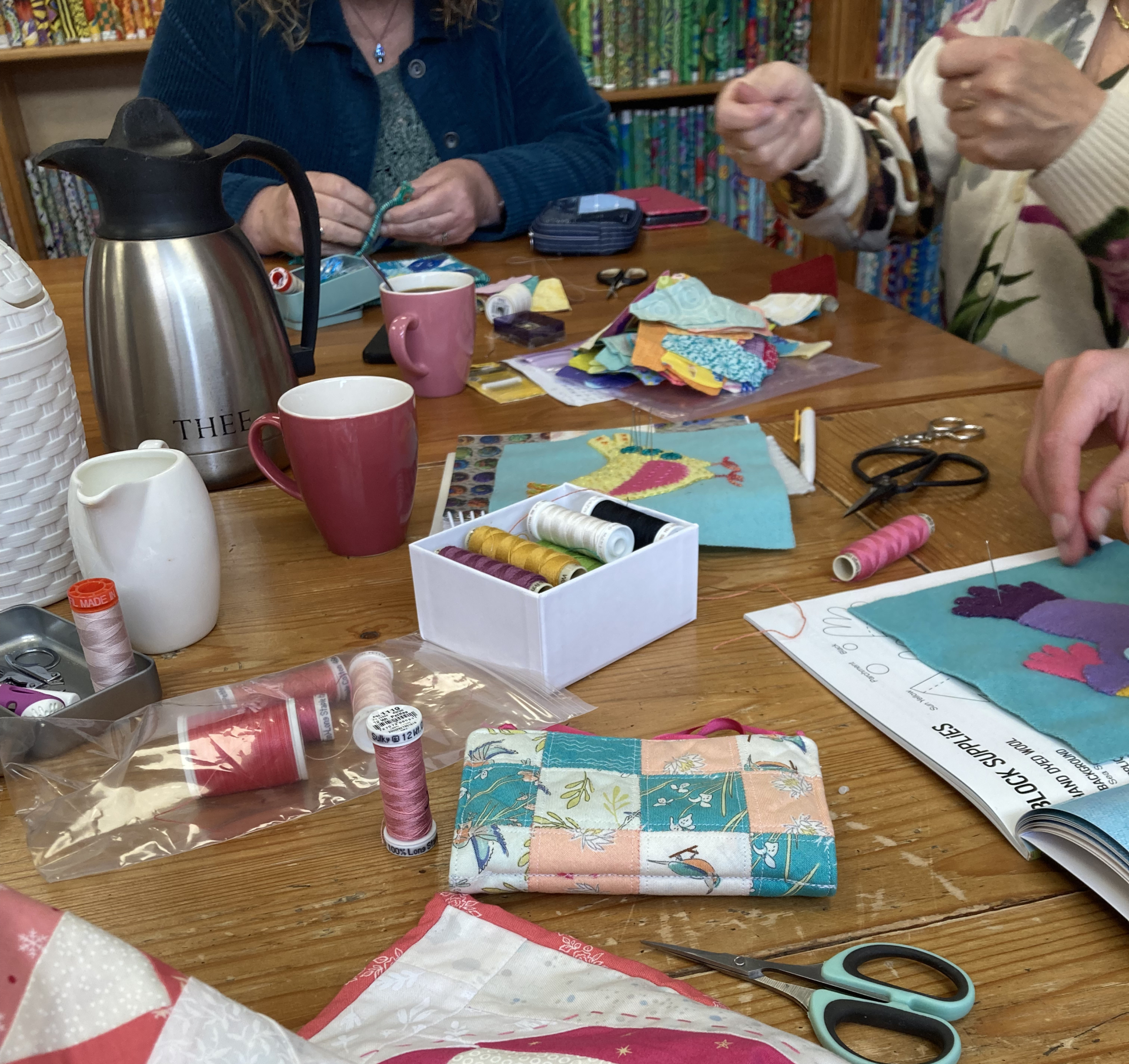 Vanwege de ruimte in de winkel hadden we afgesproken dat iedereen een handwerkje mee zou nemen, er kwam van alles voorbij. Zo werd er door Irene gewerkt aan een project van Sue Spargo, de vogeltjes, Ingrid zette bindingen aan een aantal leuke mugrugs en Sanne werkte aan de Super Nova van Tula Pink een English Paper project. Er werden blokjes gemaakt voor de Pick a Petal door Annette, Mique werkte aan een needle turn project van Sarah Fielke en Susanne Otto maakte de binding van een ByAnnie tas af. Kortom, allerlei totaal verschillende projecten!