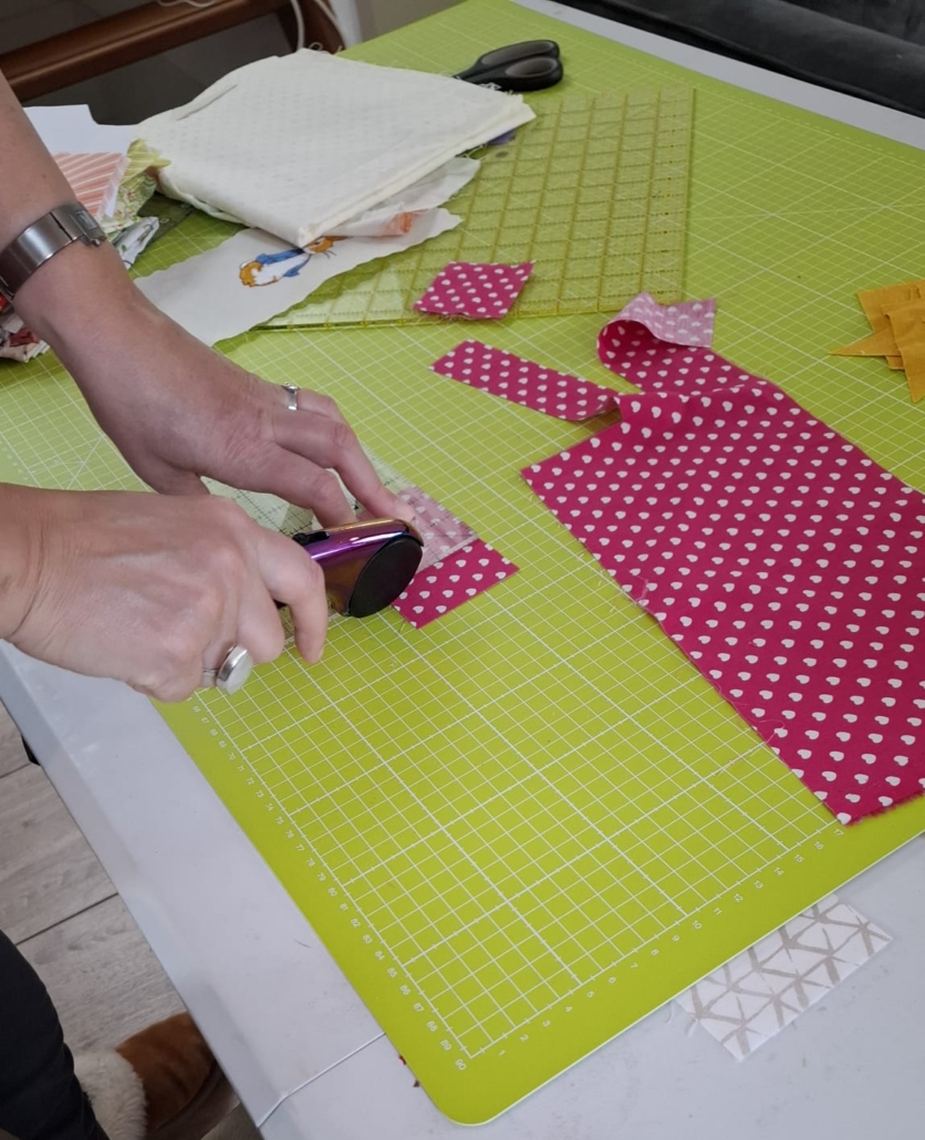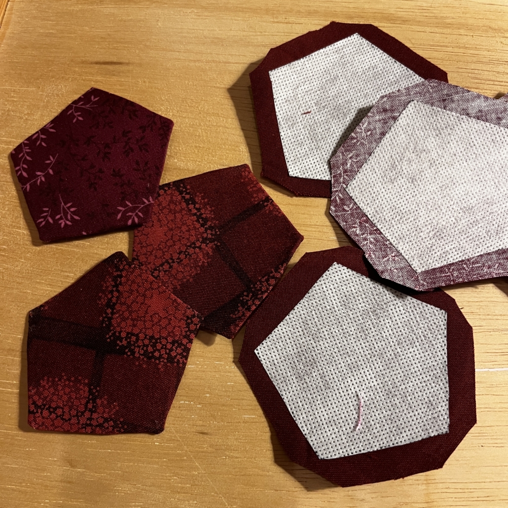 Ik wilde mezelf niet uitdagen met té kleine stukjes, dus nam ik een zijde van 4 cm. De vijfhoek trok ik 12 keer over op een medium versteviger en streek deze vast op de achterkant van een aantal bij elkaar passende stofjes. Knipte ze uit met een naadtoeslag, en lijmde deze om de versteviging heen. Tot zover klinkt het eenvoudig, maar dit is niet iets wat ik dagelijks doe, dus ik liep nogal te worstelen.