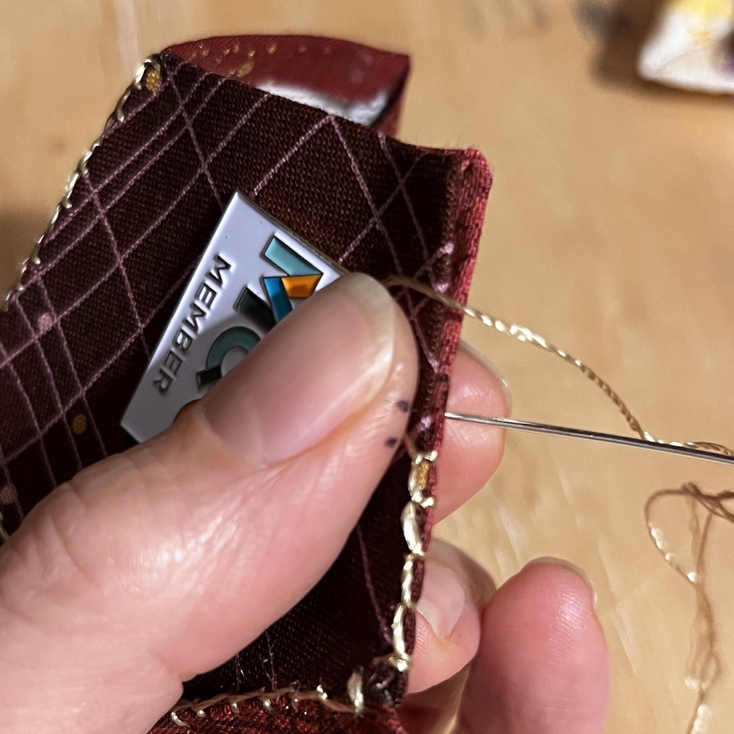 Het laatste stukje dichtzetten viel eigenlijk wel mee. Ik kon de magneet niet meer gebruiken, maar de vulling gaf ook al steun aan het vasthouden van de twee vijfhoeken om te kunnen naaien.