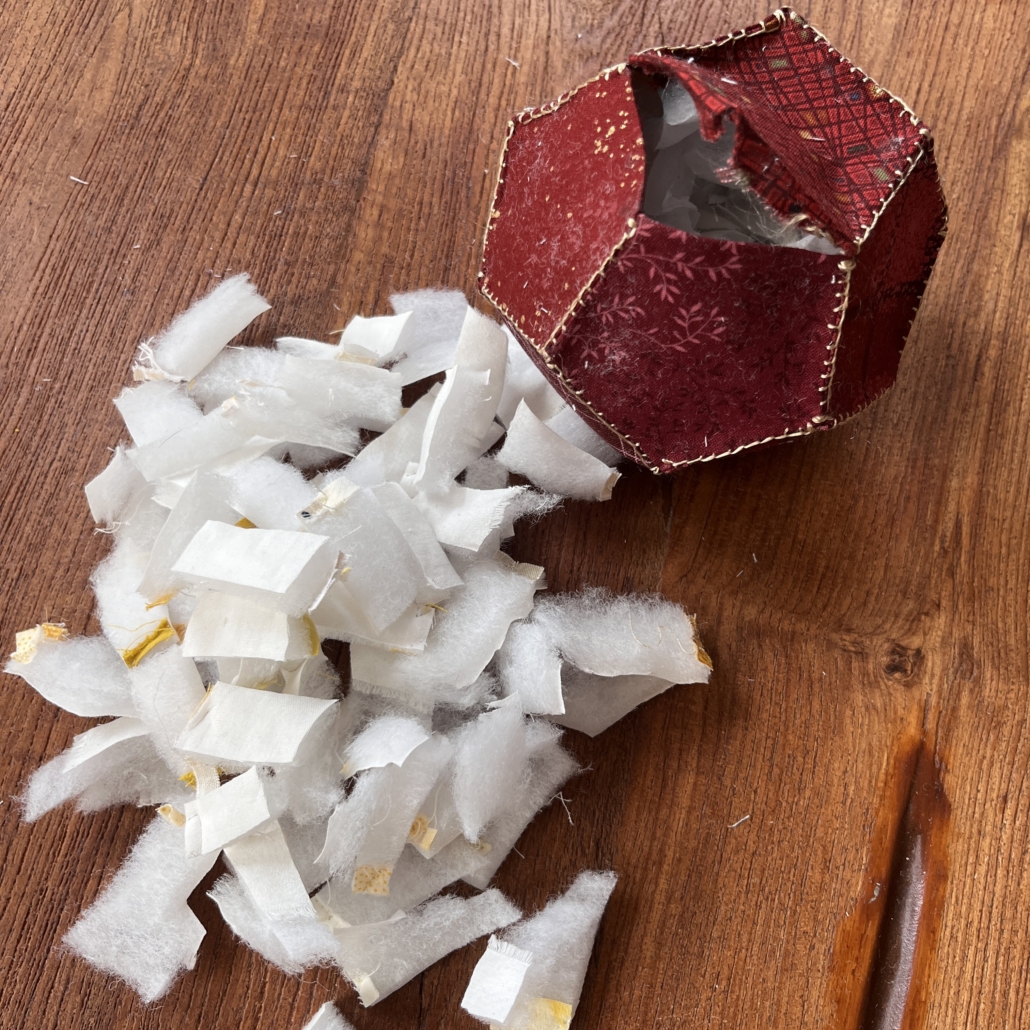 Vervolgens zette ik deze twee helften aan elkaar vast. Toen ik nog één punt (twee zijdes van een vijfhoek) open had, stopte ik er resten tussenvulling in.