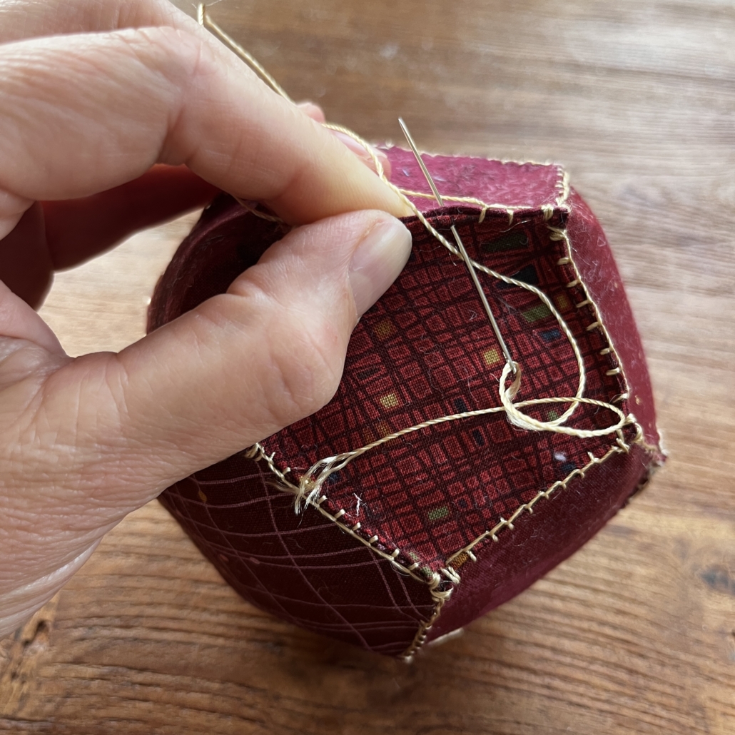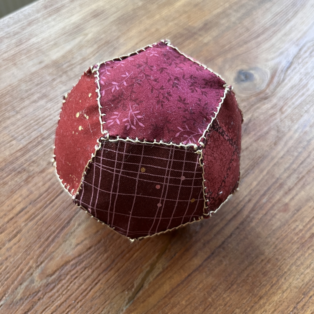 De ‘bal’ is wat groot geworden voor een kerstbal in de boom, dat had ik even niet zo ingeschat  toen ik voor de zijde van 4 cm koos. Maar dit is wel een leuk formaat voor een speelbal voor ons kleinkind – komt het toch nog goed terecht…