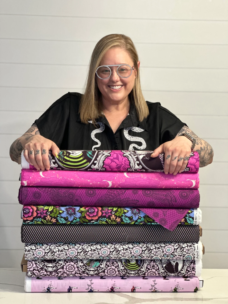 Tula Pink is een Amerikaanse quilter die in een klein stadje in de buurt van Kansas City, Missouri, USA, woont. De meesten van jullie kennen haar waarschijnlijk als stofdesigner, maar ze heeft ook verschillende boeken geschreven. Ze is in Southern California geboren en opgegroeid. Hier heeft ze in Los Angeles aan het Otis College of Art and Design gestudeerd. Na haar studie begon ze als tentoonstelling ontwerper bij verschillende musea in California te werken tot haar dat te saai werd. Ze wisselde naar de muziekindustrie, maar na 5 jaar gaf ze dit ook op en ging op zoek naar een nieuw thuis verder naar het oosten. Zo bleef ze in Missouri hangen. Een staat waar overigens veel gebeurt op quiltgebied, denk bijvoorbeeld aan de Missouri Star Company, Hamilton (een quiltstadje) en Angela Walters, allemaal in haar buurt.