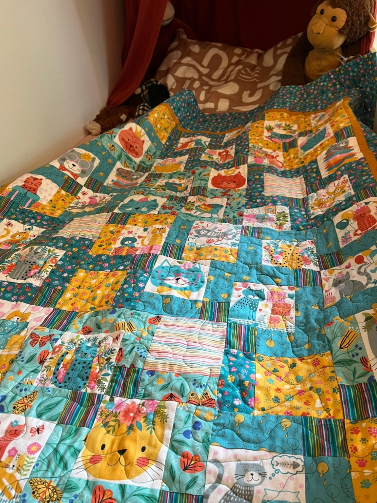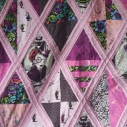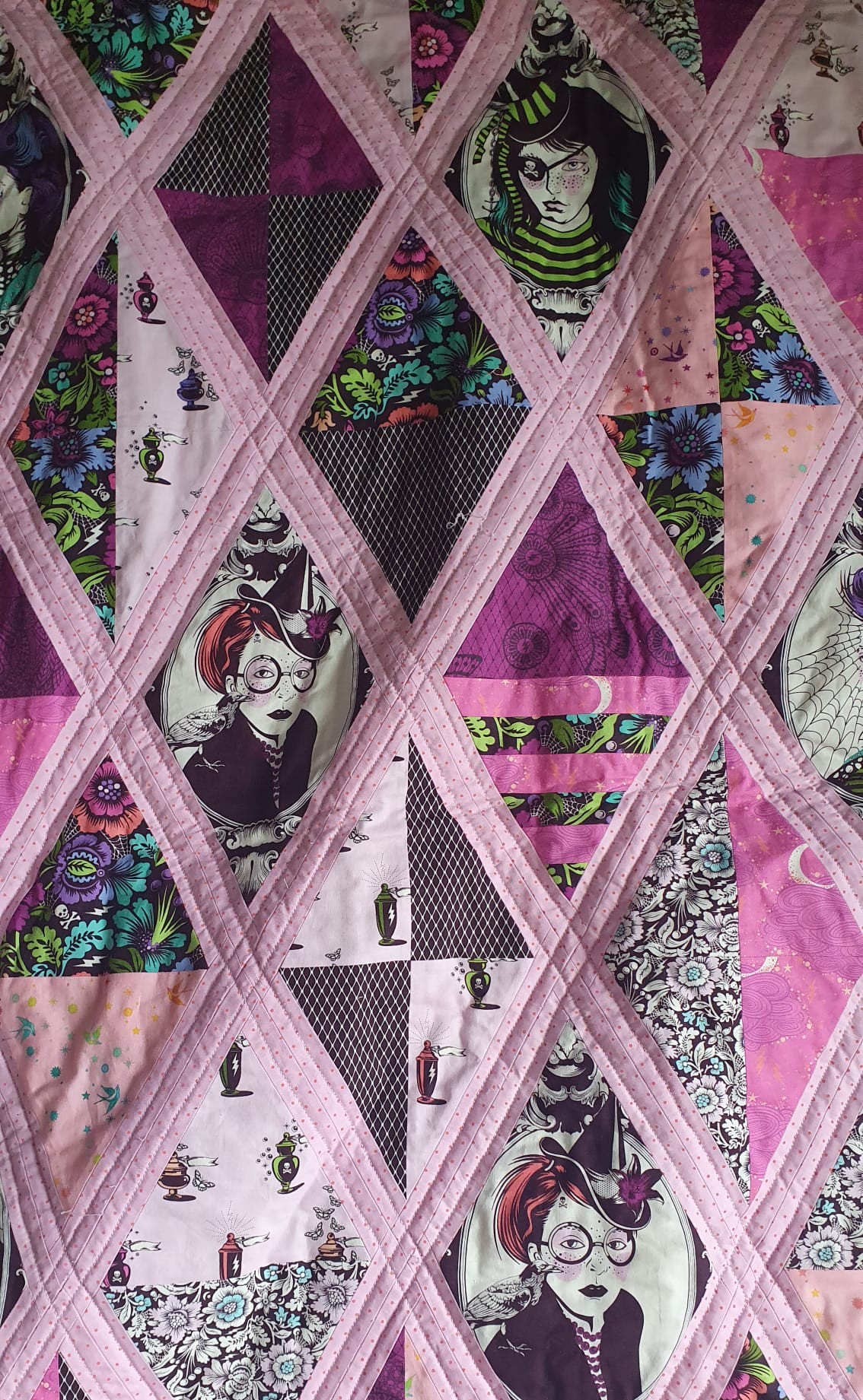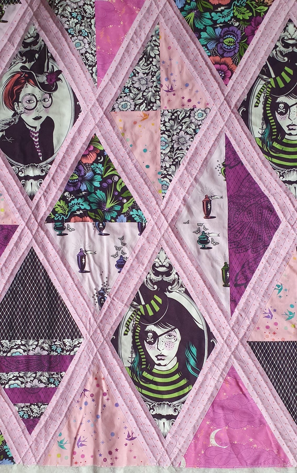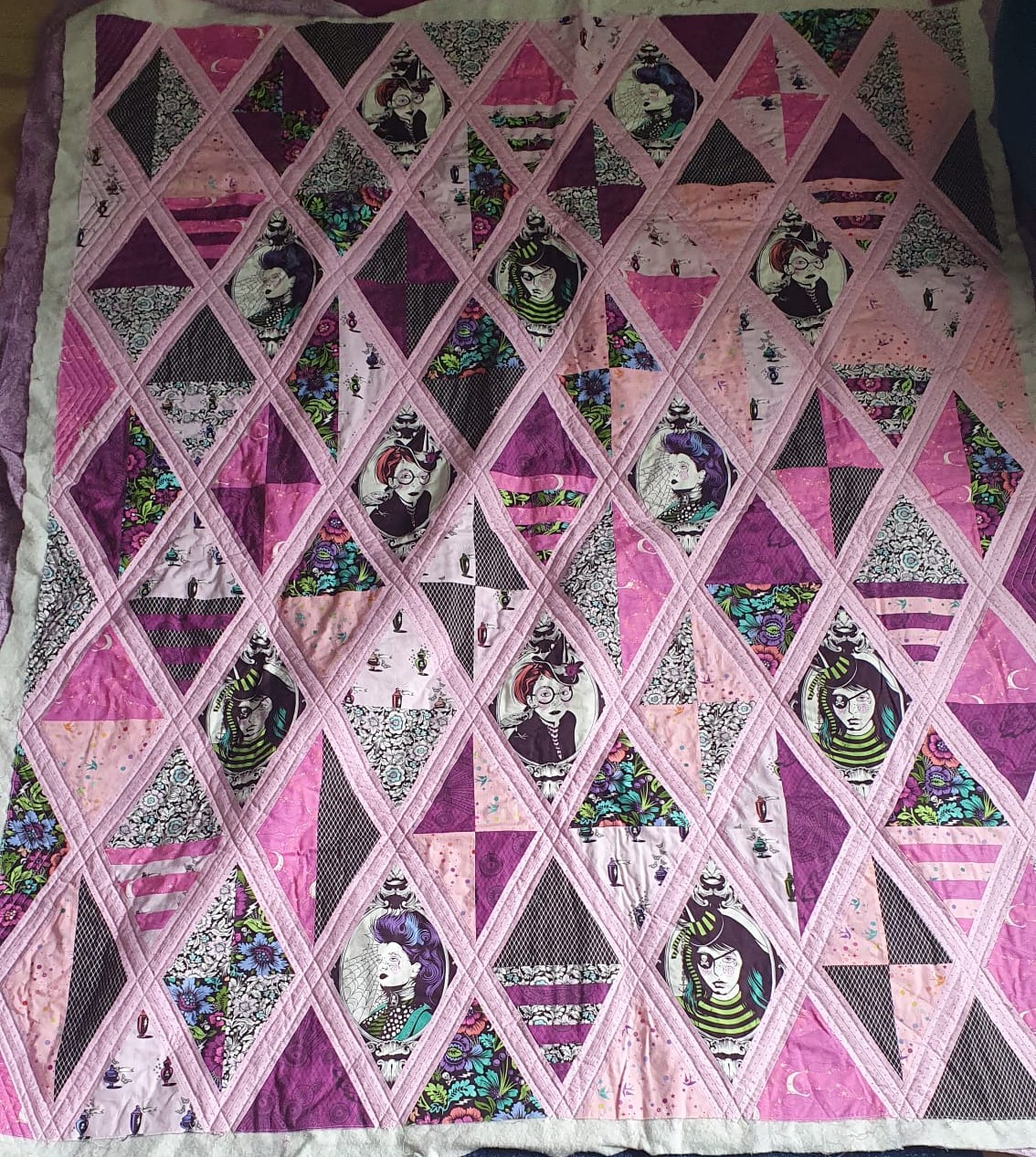 Eigenlijk is een quilt als deze heel geschikt om lekker je free motion quilten op te oefenen. Of om een bepaald patroon met een ruler te herhalen. Elke ruit is een oppervlak dat je kunt invullen. Met zo veel herhaling krijg je het quilt patroon zeker snel in de vingers.