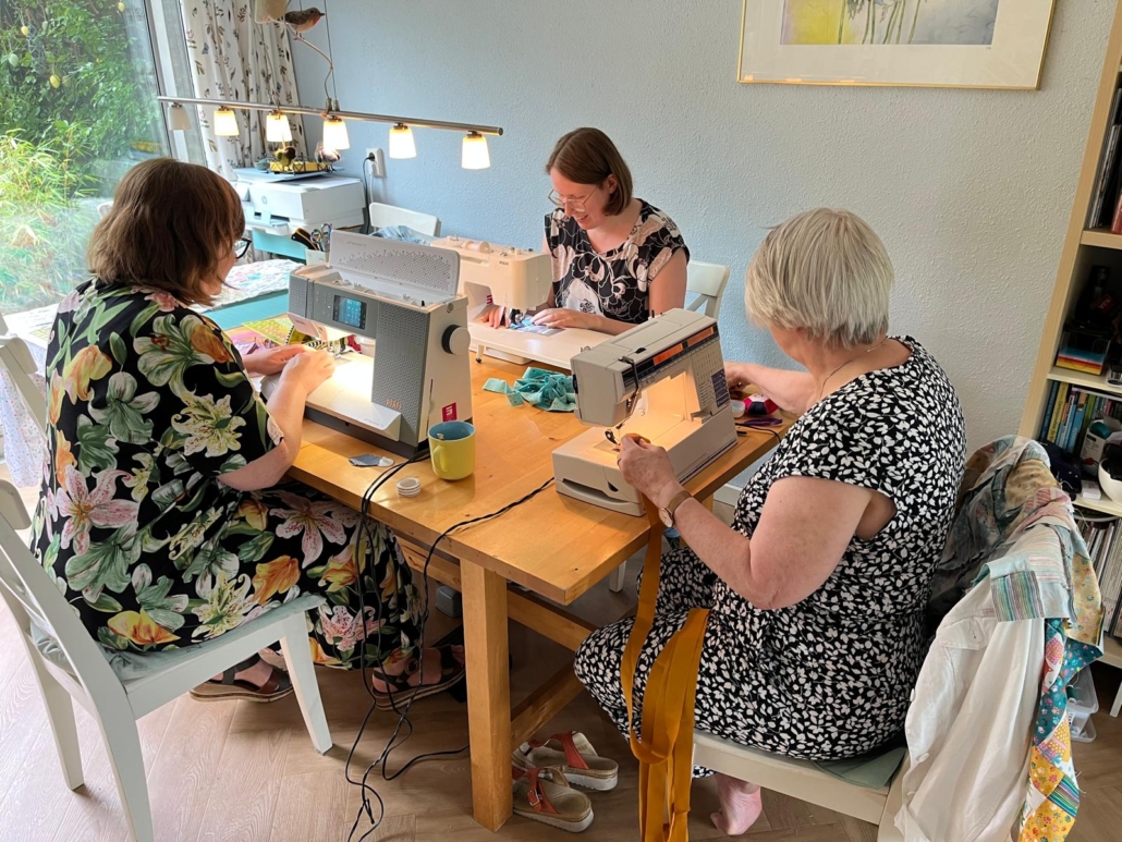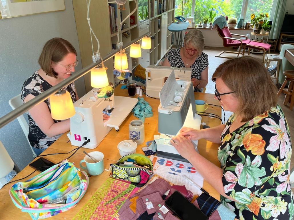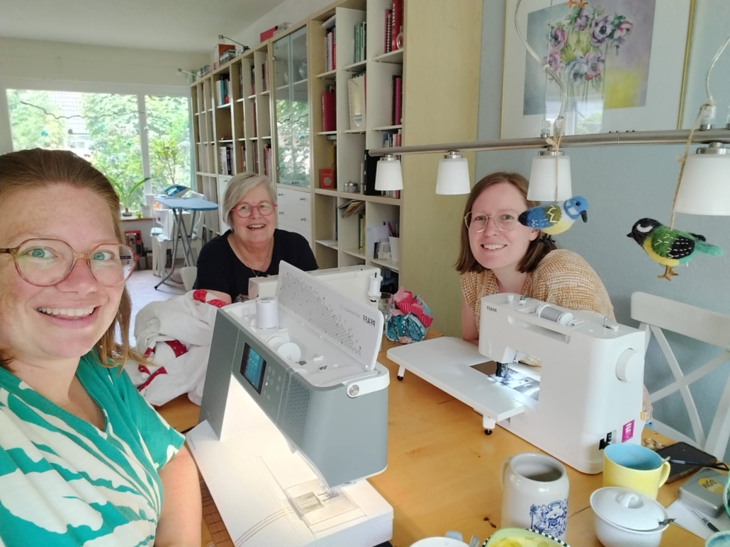 Een schamele vier jaar later was het zover en zijn we samengekomen in de woonkamer van Ineke in Raalte. Inmiddels heb ik Bronwyn ook aangestoken met het quilt-virus, dus zij deed ook lekker mee. Ineke heeft een hele fijne lange quilttafel (de niet-quiltende medemens noemt dit een eettafel) waar we comfortabel met onze machines kunnen werken. Ook heeft ze een fijn hoekje gemaakt met een snijmat en linialen en kunnen we makkelijk bij de strijkbout. Een fijne plek om te quilten, dus!