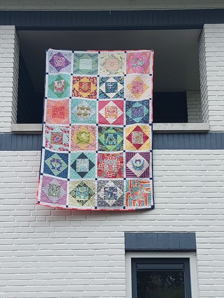 Een fantastisch weekend! We hebben iedere finish of deel daarvan met gejuich gevierd. Elkaar aangemoedigd als dat nodig bleek. Geholpen met beslissingen en met het aanleren van nieuwe technieken. Tijdens dit weekend zijn in ieder geval 2 quilts van binding voorzien, 2 tassen gemaakt, een piece keeper gemaakt, een scrapbasket gemaakt, een quilt helemaal doorgequilt, talloze Tula Pink blokjes gemaakt, en nog veel meer.