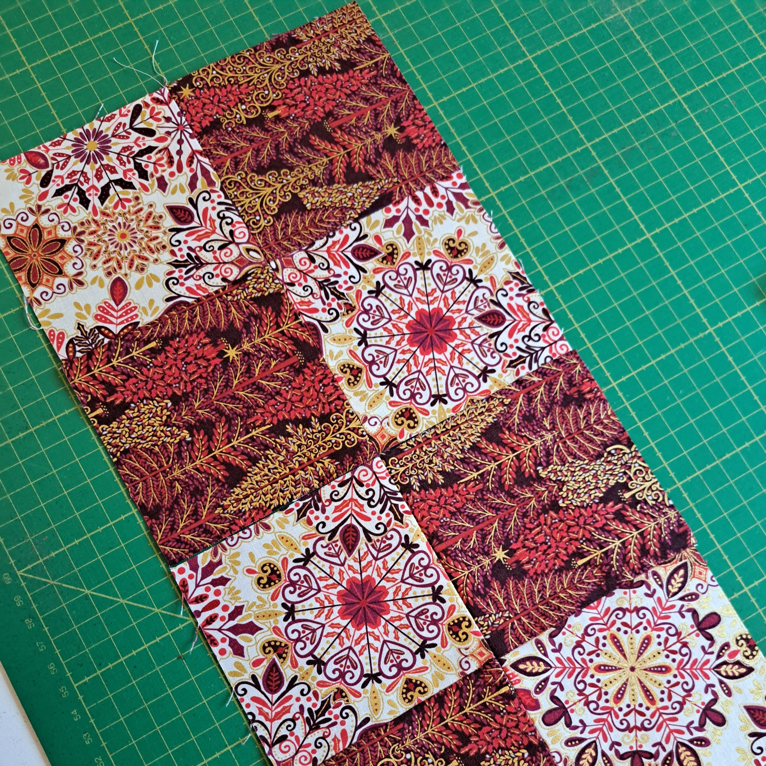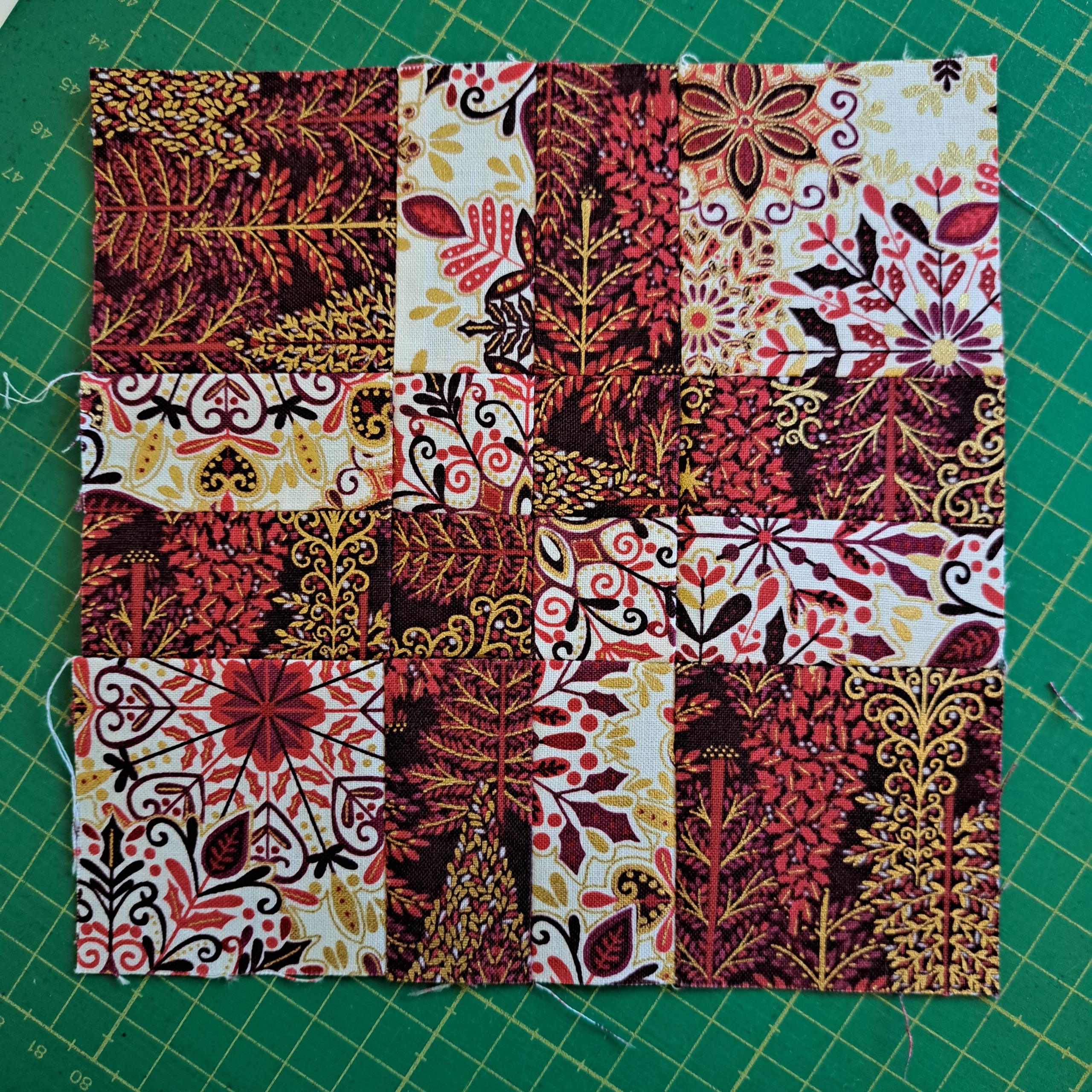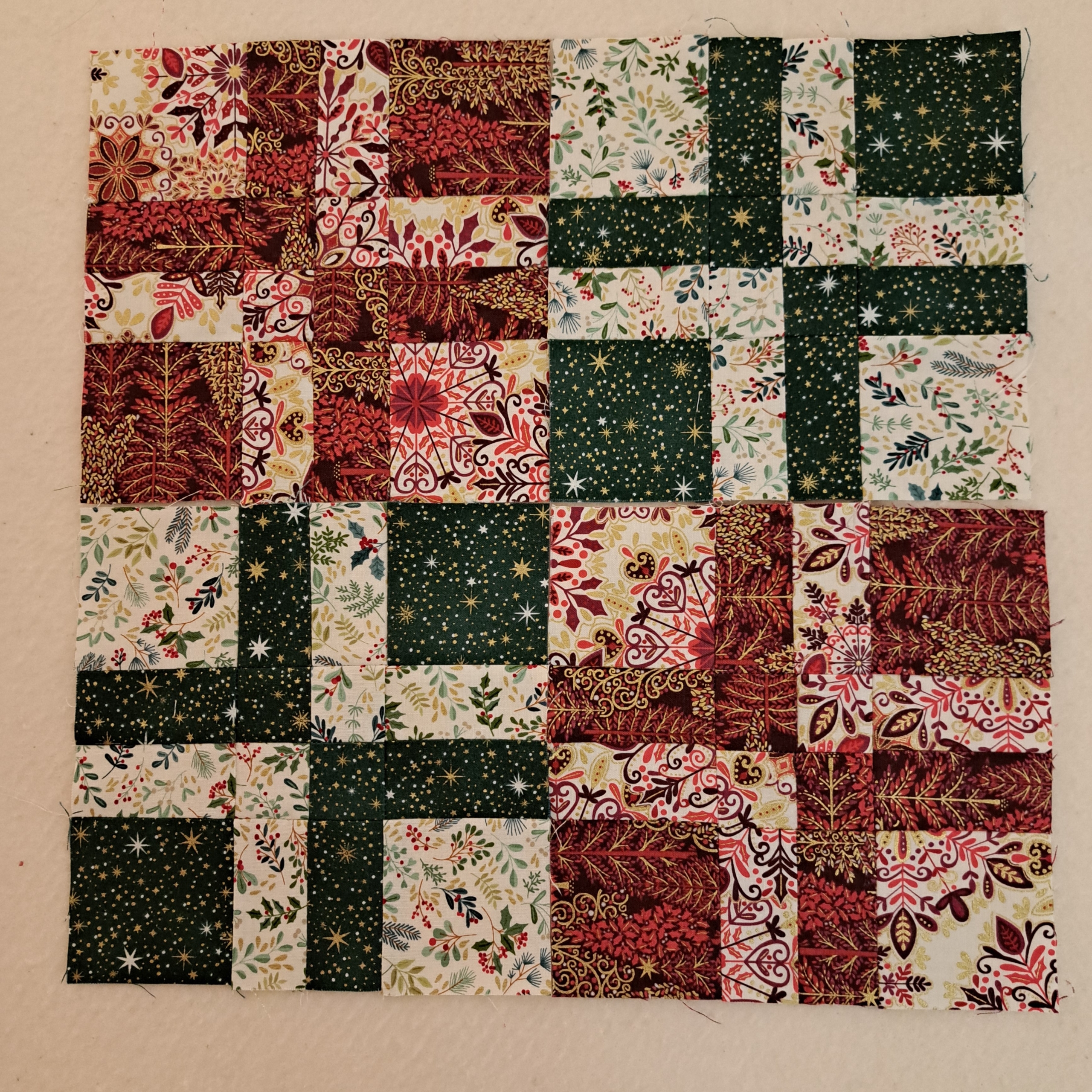 Eind november vond de eerste les plaats. Ik had tot op dat moment het idee dat ik gewoon met kleine stukjes zou beginnen en daar telkens iets meer aan zou naaien. Toen ik mijn 4-patch in negen stukken moest snijden, schrok ik wel even. Dit vond mijn innerlijke perfectionist niet heel fantastisch. Ik had deze vier lapjes stof met heel veel zorg aan elkaar genaaid en dan moest ik die nu ‘kapot’ maken. Met grote twijfels sneed ik de negen stukken uit de 4-patch. Toen we de stukken daarna draaiden en er een nieuw patroon ontstond, was ik verrast. Dit was heel anders dan alleen het lapjes aan elkaar naaien dat ik in gedachten had!