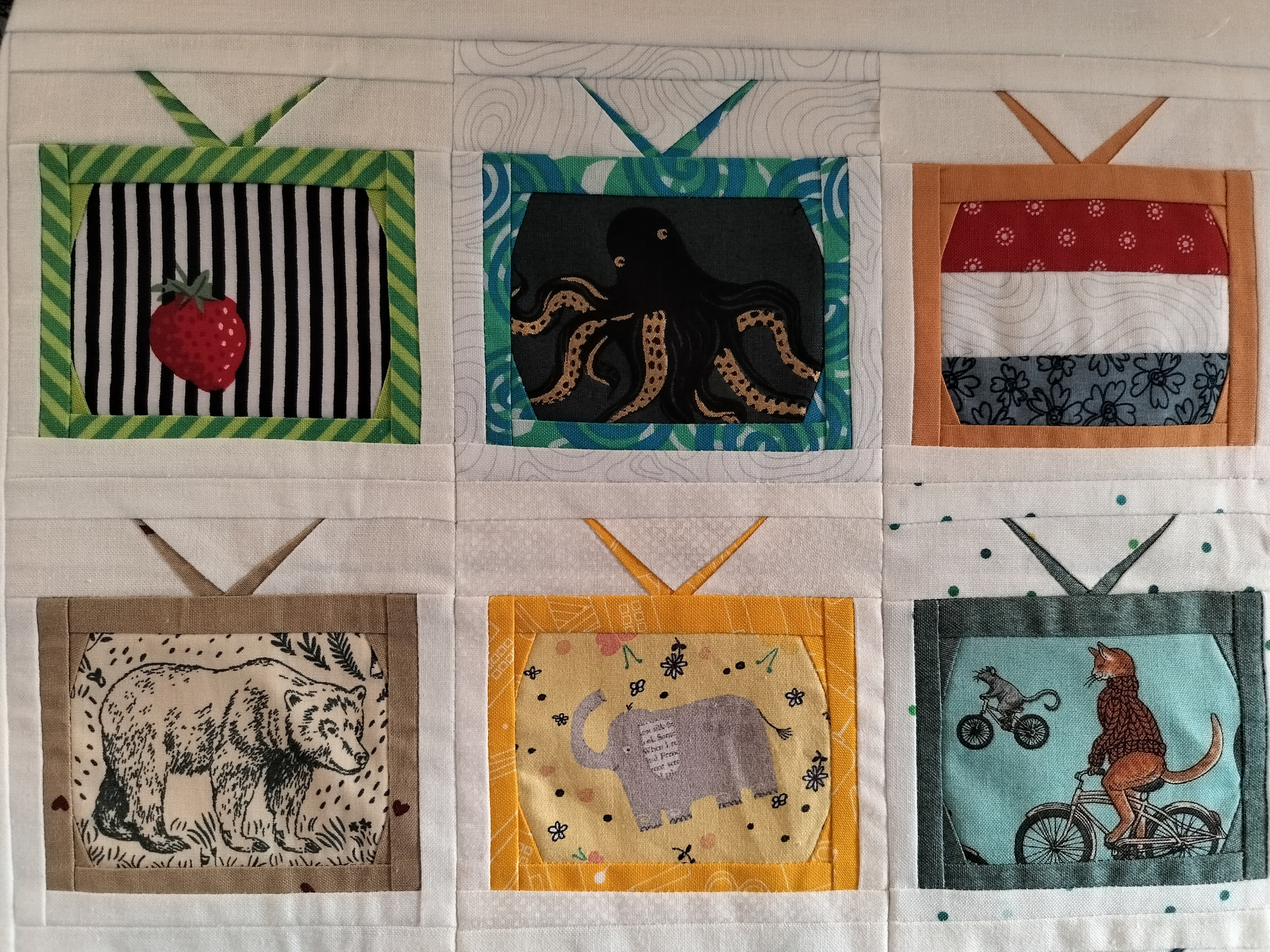 Elke maand iets maken in een gegeven kleur, het maakt niet uit wat. Dat was voor mij heel breed en ik verzoop een beetje in de mogelijkheden. Voor mij betekent dit dan dat er vervolgens niets meer uit mijn handen komt. Quiet Play kwam tot de redding. Ze lanceerde een fussy cutting quiltalong met een heel leuk klein FPP patroontje. Gelijk wist ik het: dit ga ik gebruiken voor het jaar van kleur. Het is een heel klein old-school tv’tje met antenne. In het scherm kun je fussycutten wat je wil. Perfect voor al mijn restjes en leuke stofjes met prints (want van beide heb ik voldoende!). Het is maar een heel klein patroontje dus het is zo af. Twee per maand kan makkelijk!