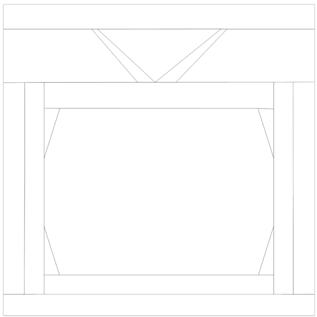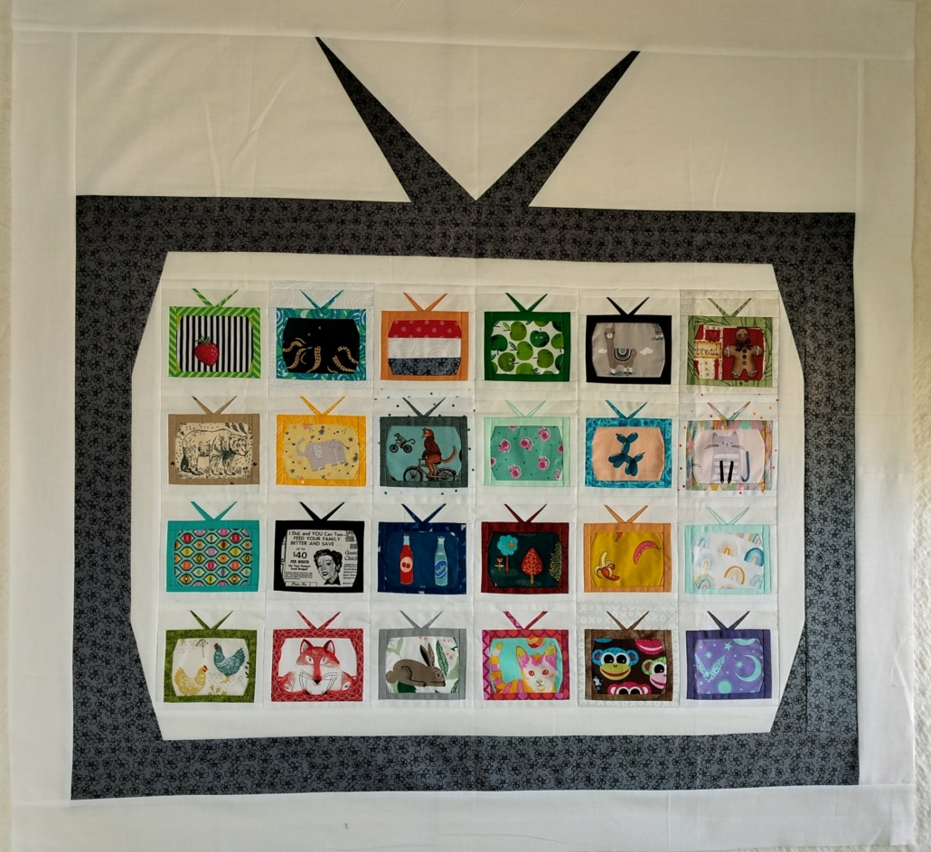Ergens in de herfst kwam mijn idee voor de quilt top. Ik wilde niet zomaar alle blokjes aan elkaar zetten. Eigenlijk wilde ik er graag een brede rand omheen zetten zodat de blokken meer omlijst zouden zijn. In een helder moment kreeg ik het idee om de tv kast na te maken in het groot. Nu zijn het 24 kleine tv’tjes in een grote tv.