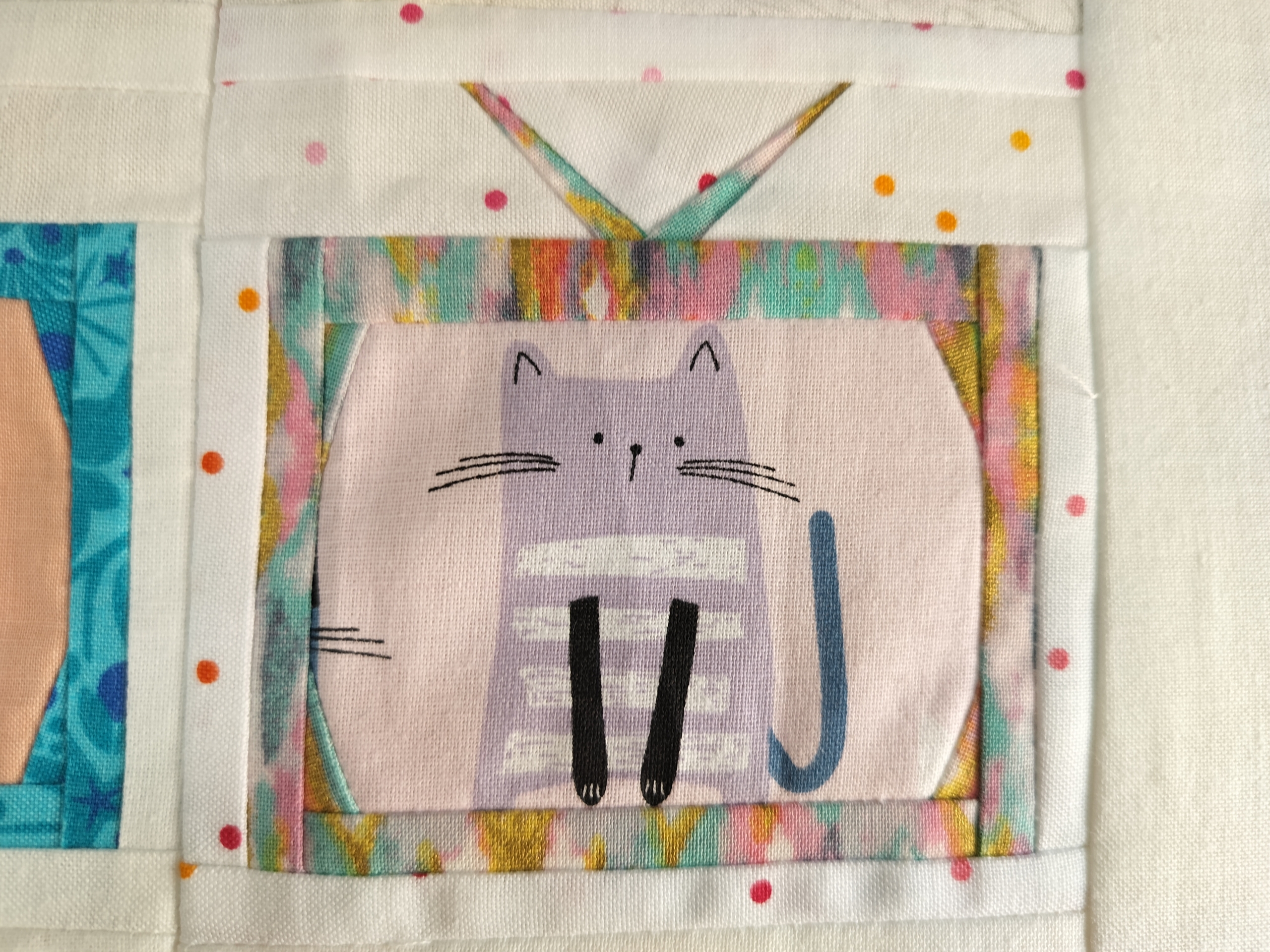 Voor mij was de meest verrassende twist de ugly. Ik had net een lading stoffen gekregen en had een klein lapje bewaard dat ik echt spuuglelijk vond. Het was alsof een eenhoorn en een elfje samen op een stukje stof hadden staan kakken. Gooi er dan nog wat goud bij en dan heb je het stofje. Als ik niet had geweten dat ik iets met een ugly moest gaan maken, had ik het lapje meteen weggegooid. Ik heb een roze stofje met kat gekozen voor het beeldscherm en het lelijke lapje gebruikt voor de tv kast. Ook kon ik een paar strookjes low volume van de (toen nog geheime) stoffenlijn van Irene gebruiken als achtergrond. Deze combinatie was een succes! Nu is het mijn favoriete blok uit de quilt. Het “lelijke” stofje doet het fantastisch in combinatie met de leuke stipjes en het roze beeldscherm.