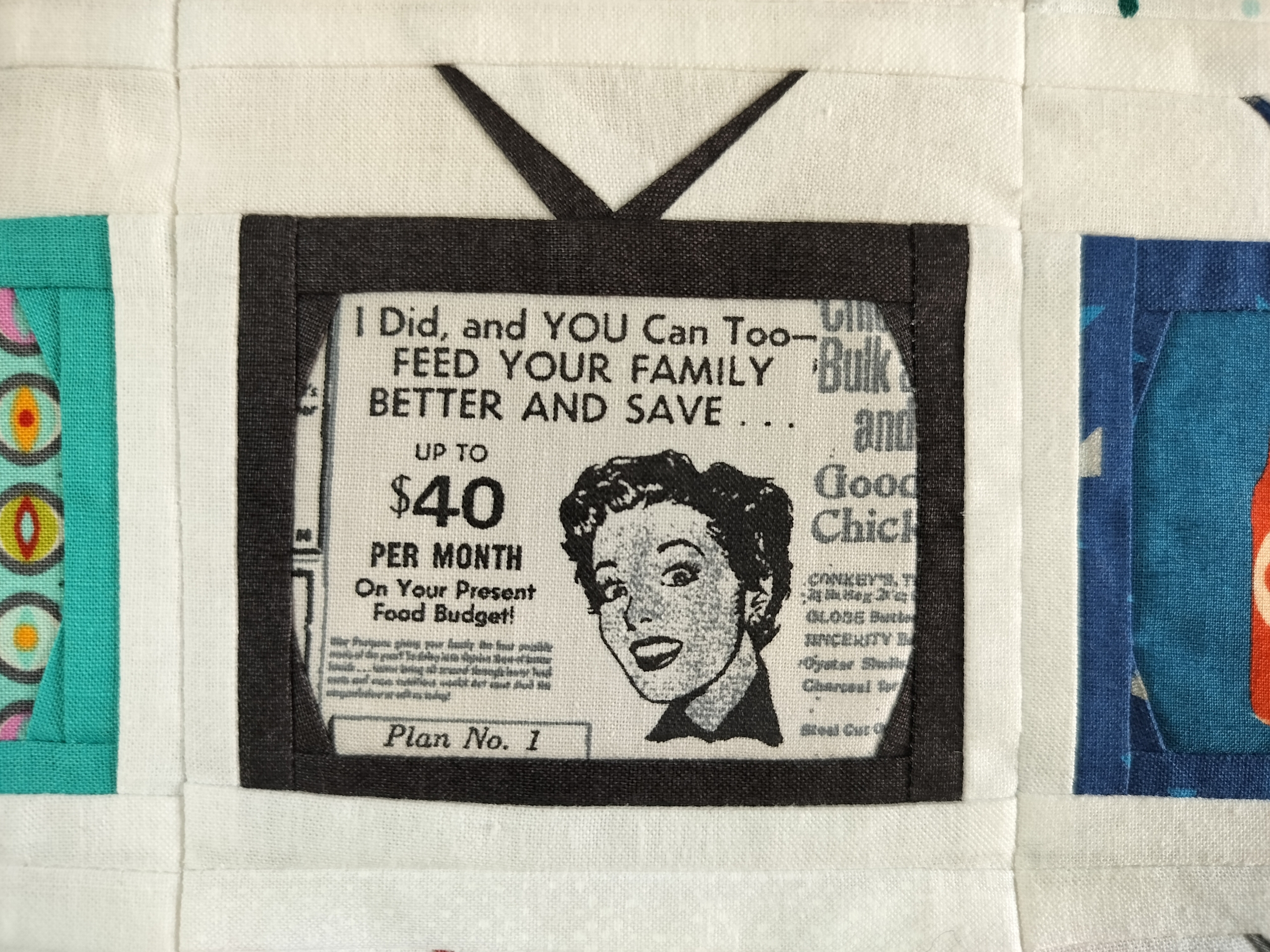 Met het resultaat ben ik echt heel blij. Er is veel in te zien en ik vind het grapje met de grote tv ook erg leuk. Ik kijk er met veel plezier naar. Misschien inspireert het schrijven van deze blog me ook wel om het quiltje te dubbelen en door te stikken zodat het ook echt af is. Wie weet! Heeft iemand suggesties voor het quilten?