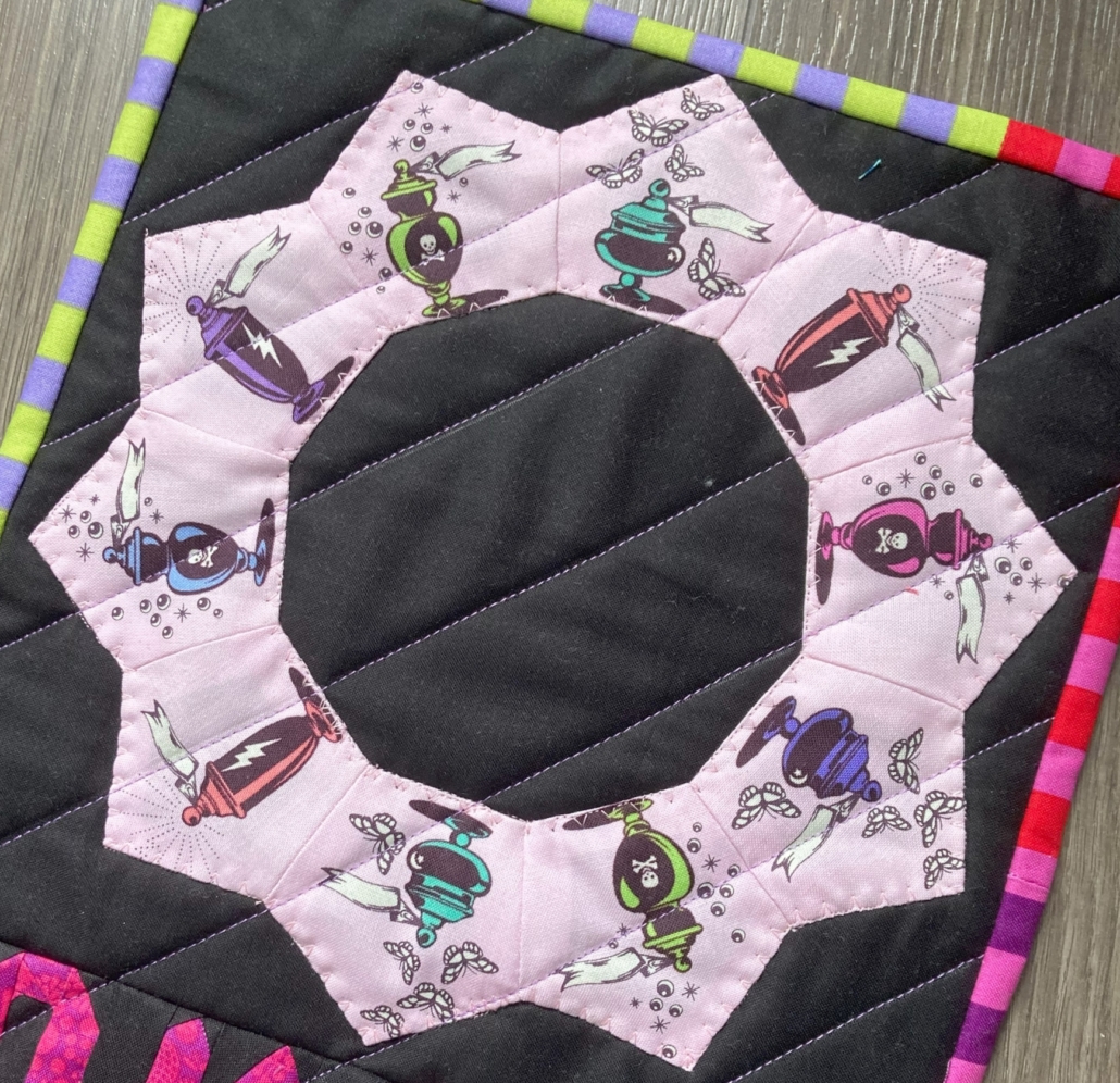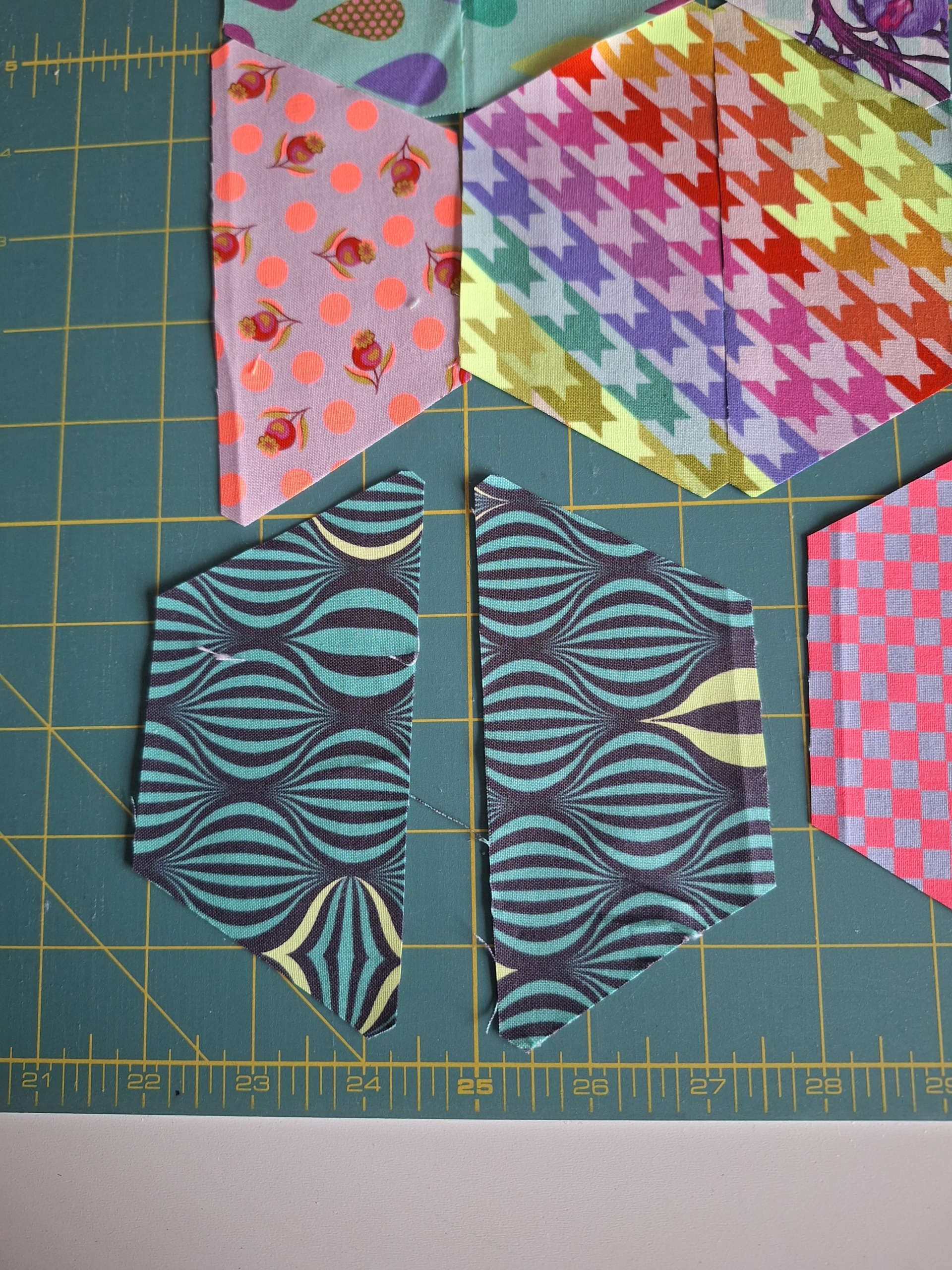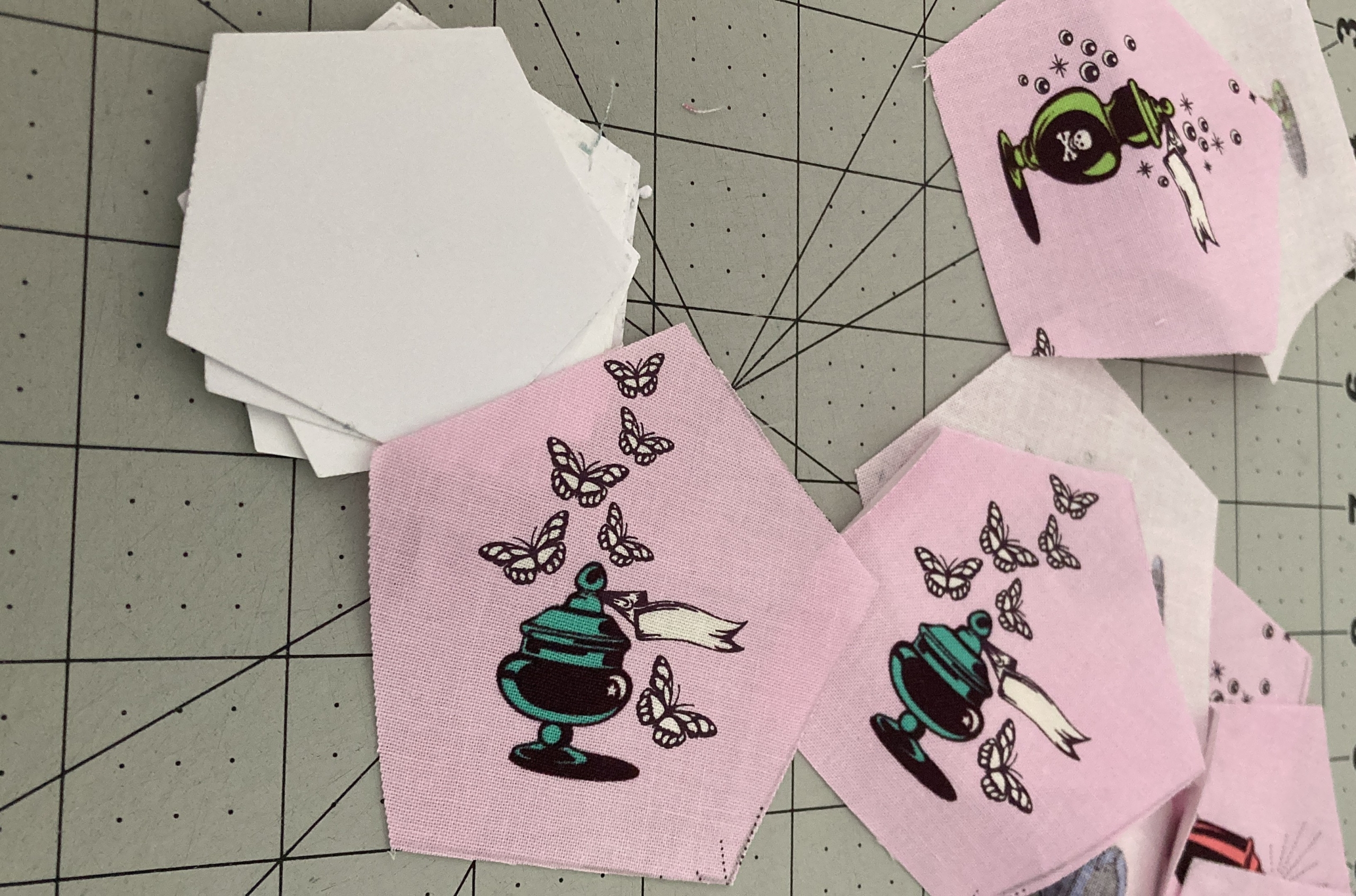 Voor de maand oktober kozen we de pentagon, voor mij toch een vorm die past bij deze maand als je denkt aan Halloween. Ik wilde dan voor mijn pentagonnen ook in dat thema blijven, en het was de perfecte maand om eindelijk in die stofjes van Tula Pink te snijden die al (te) lang mooi stonden te wezen in mijn kast. De twist voor deze maand is fussy cutting, een manier van snijden waarbij je specifieke plaatjes uit de stof snijdt ipv zo zuinig mogelijk.