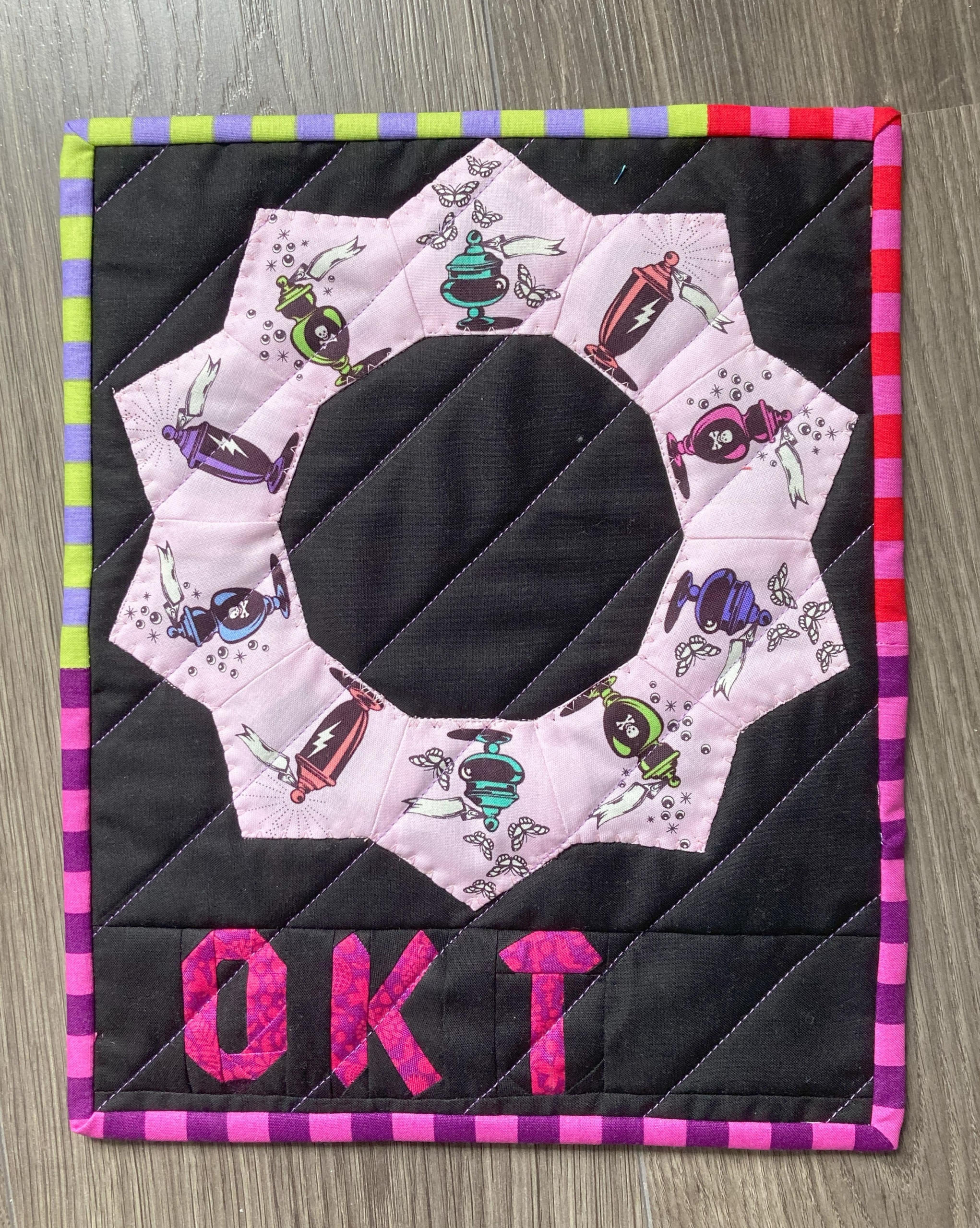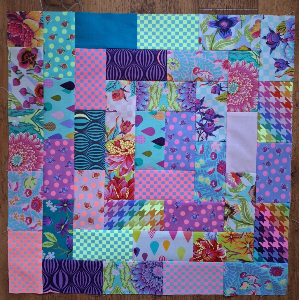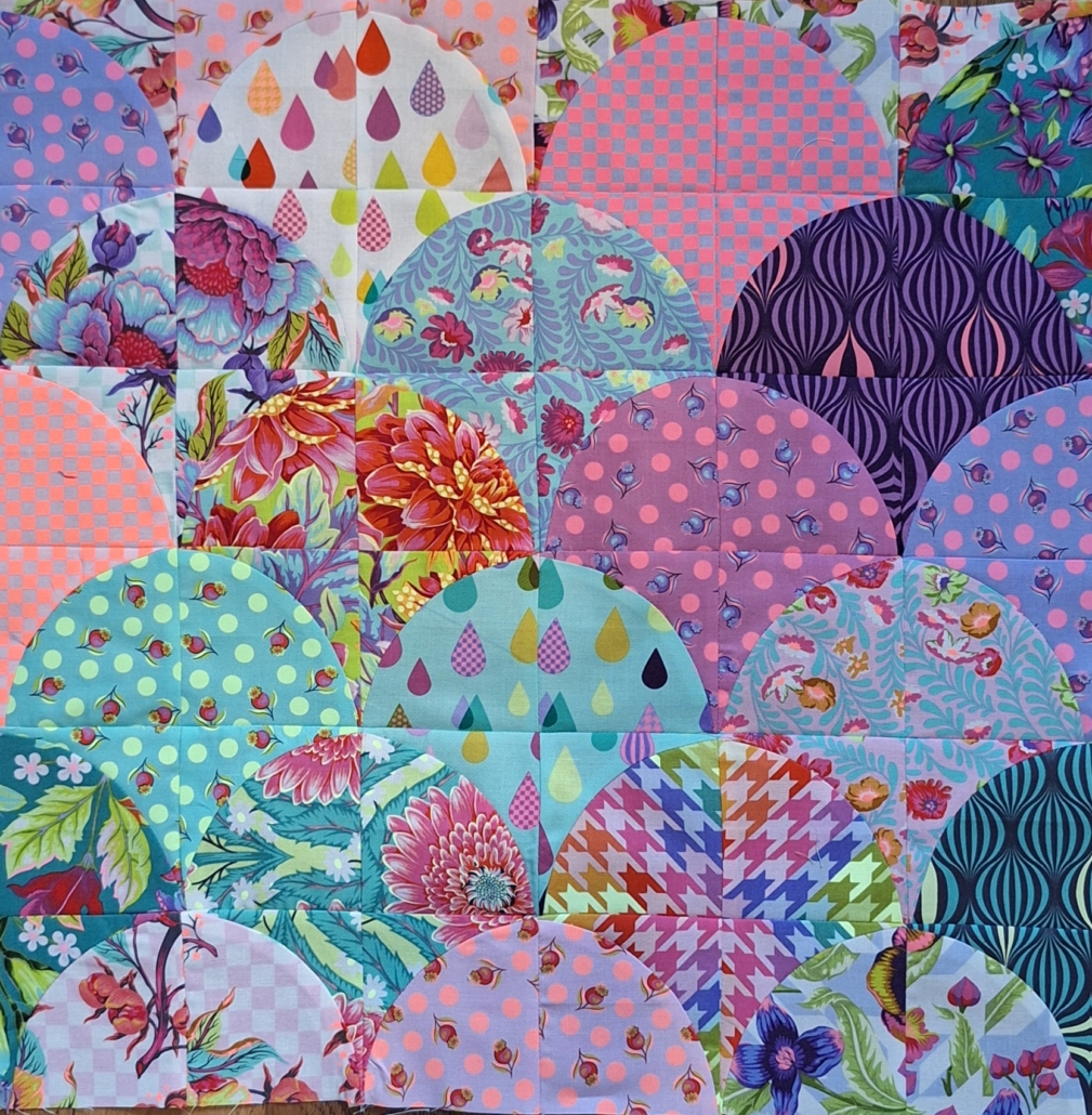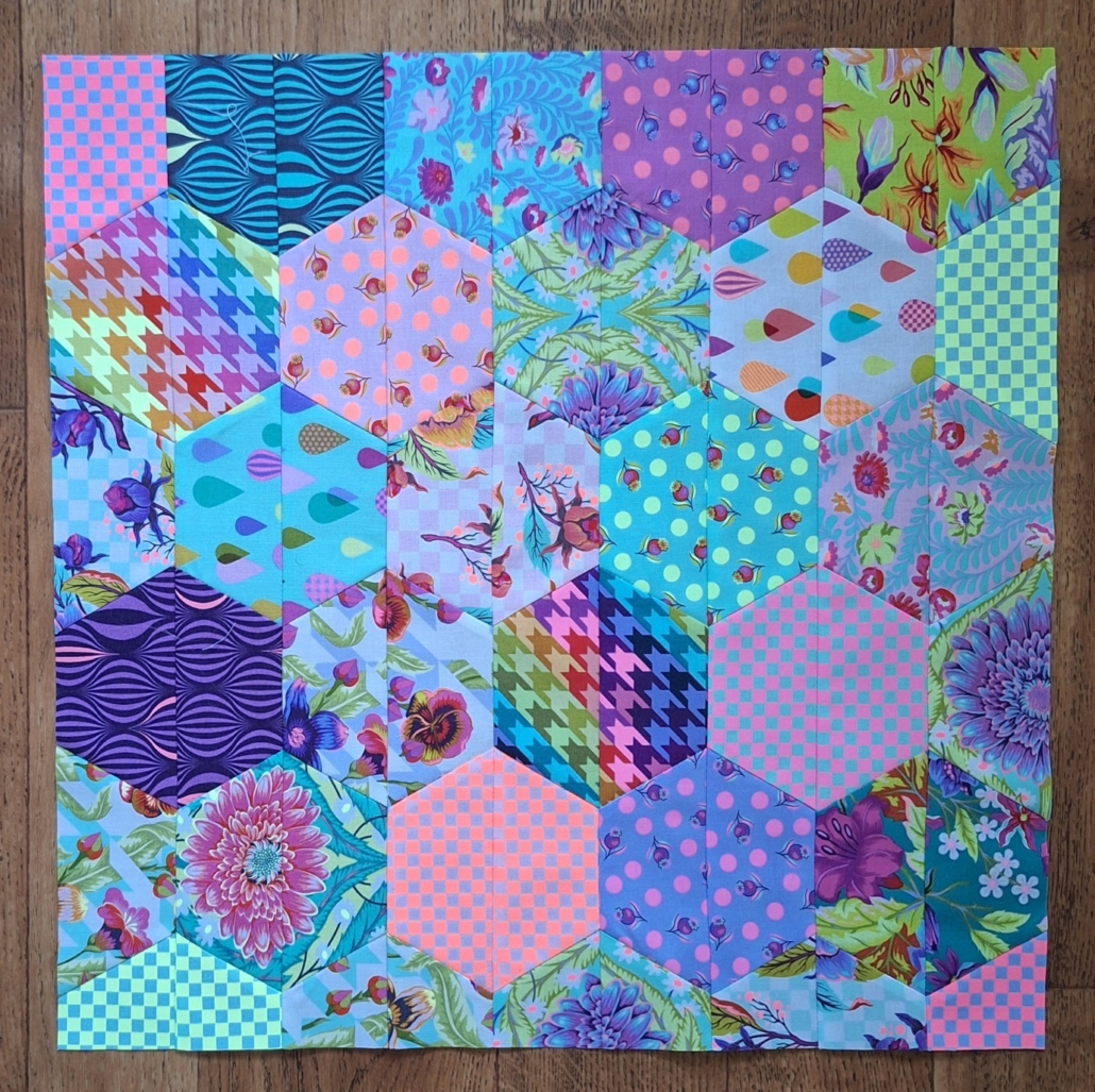 Voor de maand oktober kozen we de pentagon, voor mij toch een vorm die past bij deze maand als je denkt aan Halloween. Ik wilde dan voor mijn pentagonnen ook in dat thema blijven, en het was de perfecte maand om eindelijk in die stofjes van Tula Pink te snijden die al (te) lang mooi stonden te wezen in mijn kast. De twist voor deze maand is fussy cutting, een manier van snijden waarbij je specifieke plaatjes uit de stof snijdt ipv zo zuinig mogelijk.