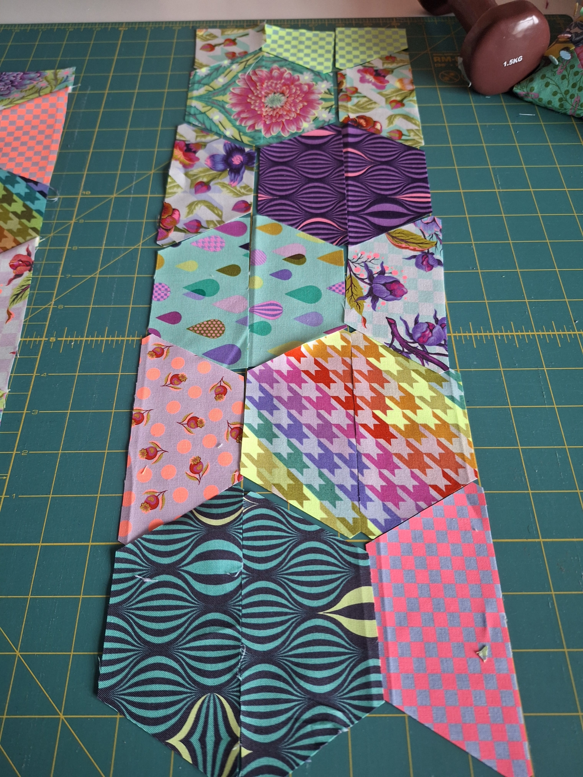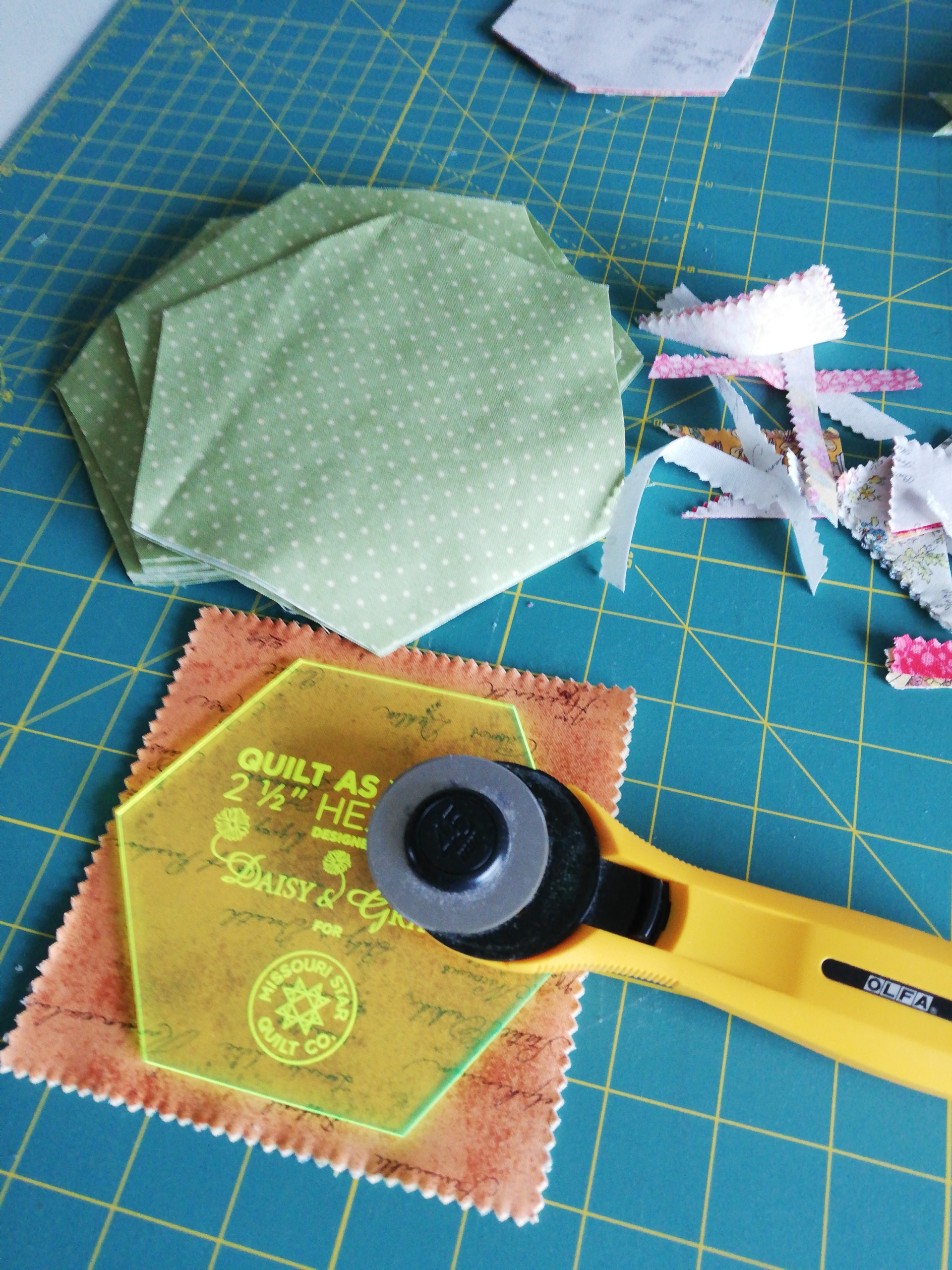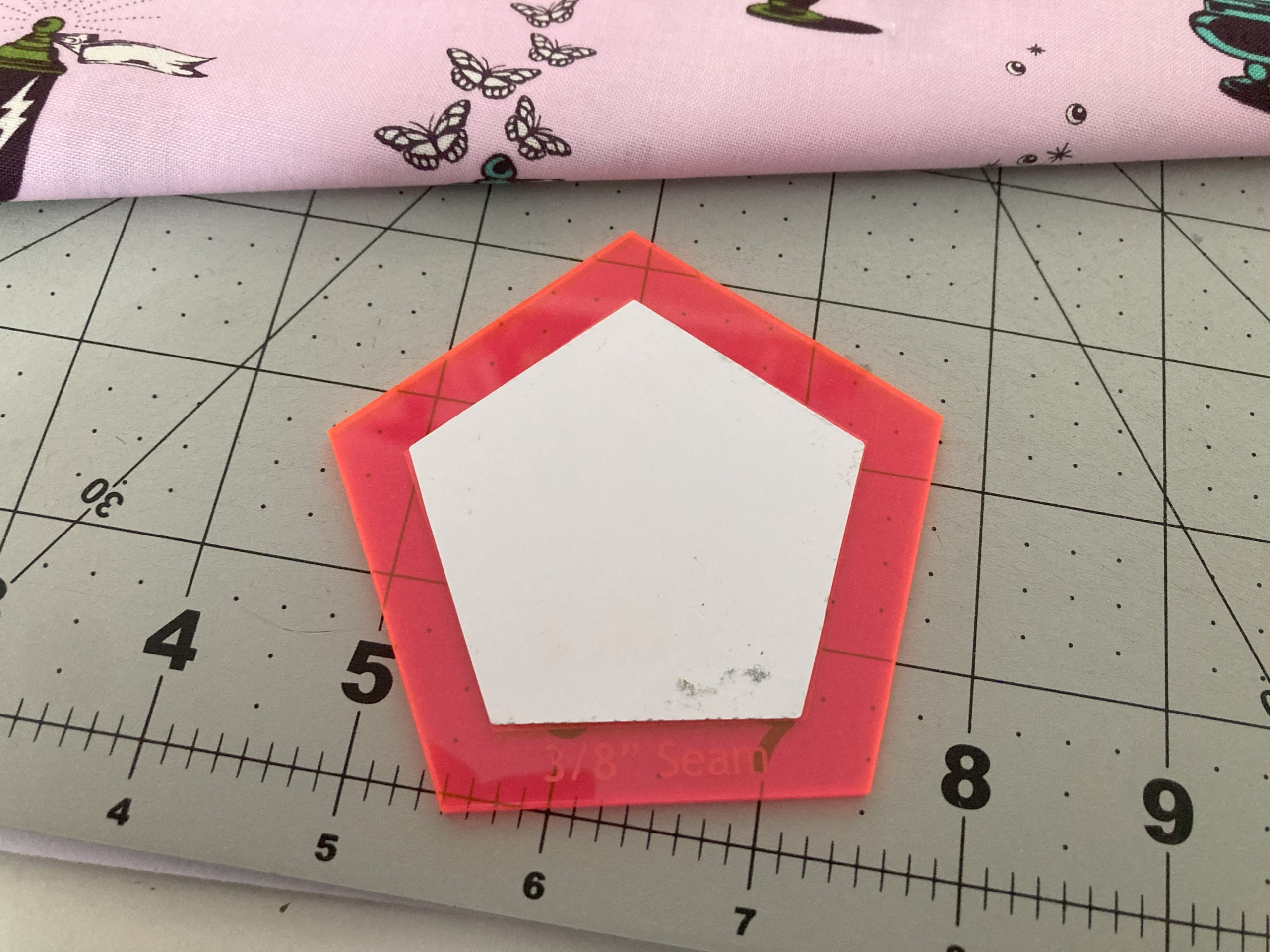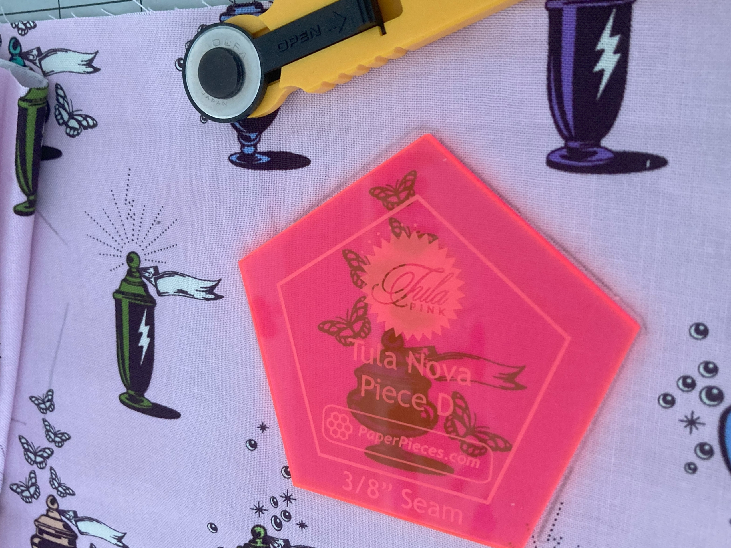 Bij het kiezen van de techniek voor pentagonnen en fussycutting kom ik al snel uit bij EPP, de (voor mij) beste manier om lastigere vormen aan elkaar te zetten. Daarnaast gebruik ik meestal een acryllen mal om de vormpjes uit te snijden, wat ideaal werkt voor fussycutting. Ik heb op de GTG in het voorjaar van Marlies haar Tula Nova gekregen en nou bleek ik de perfecte maat papiertjes nog in de la te hebben liggen.