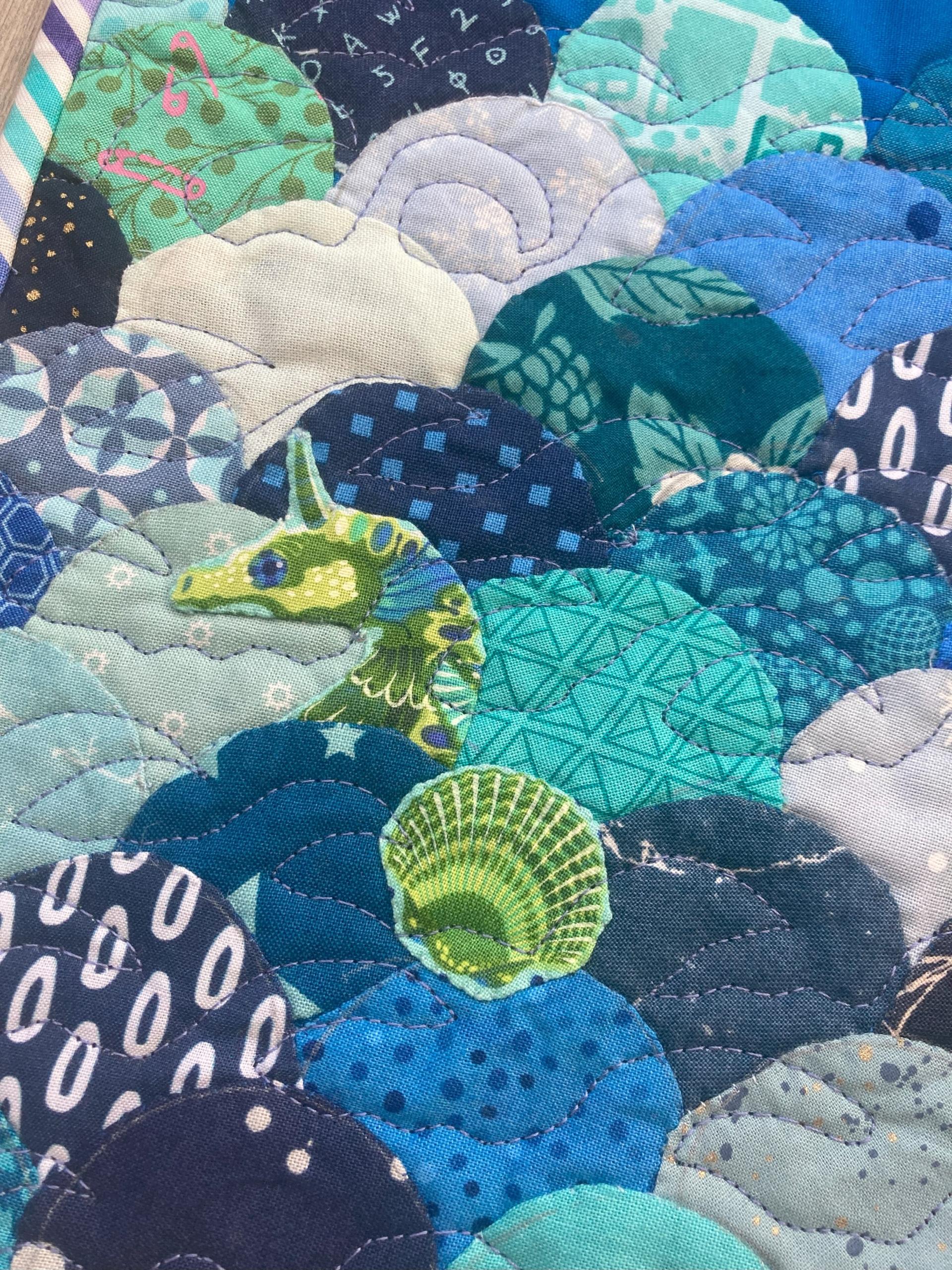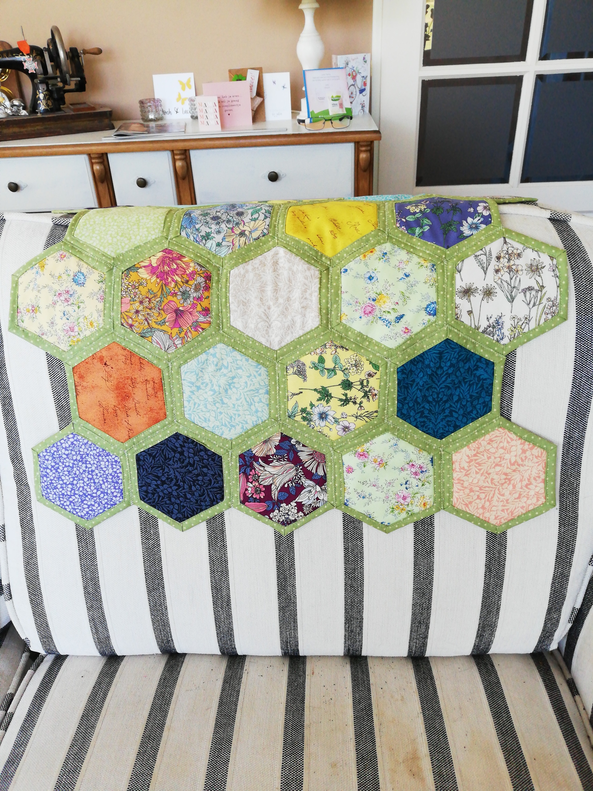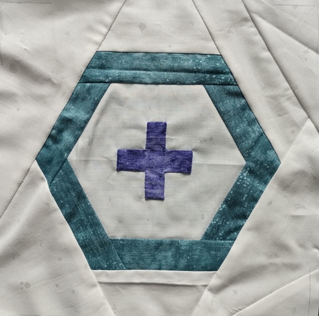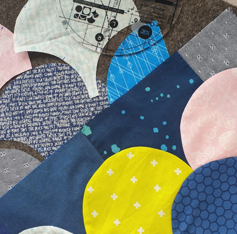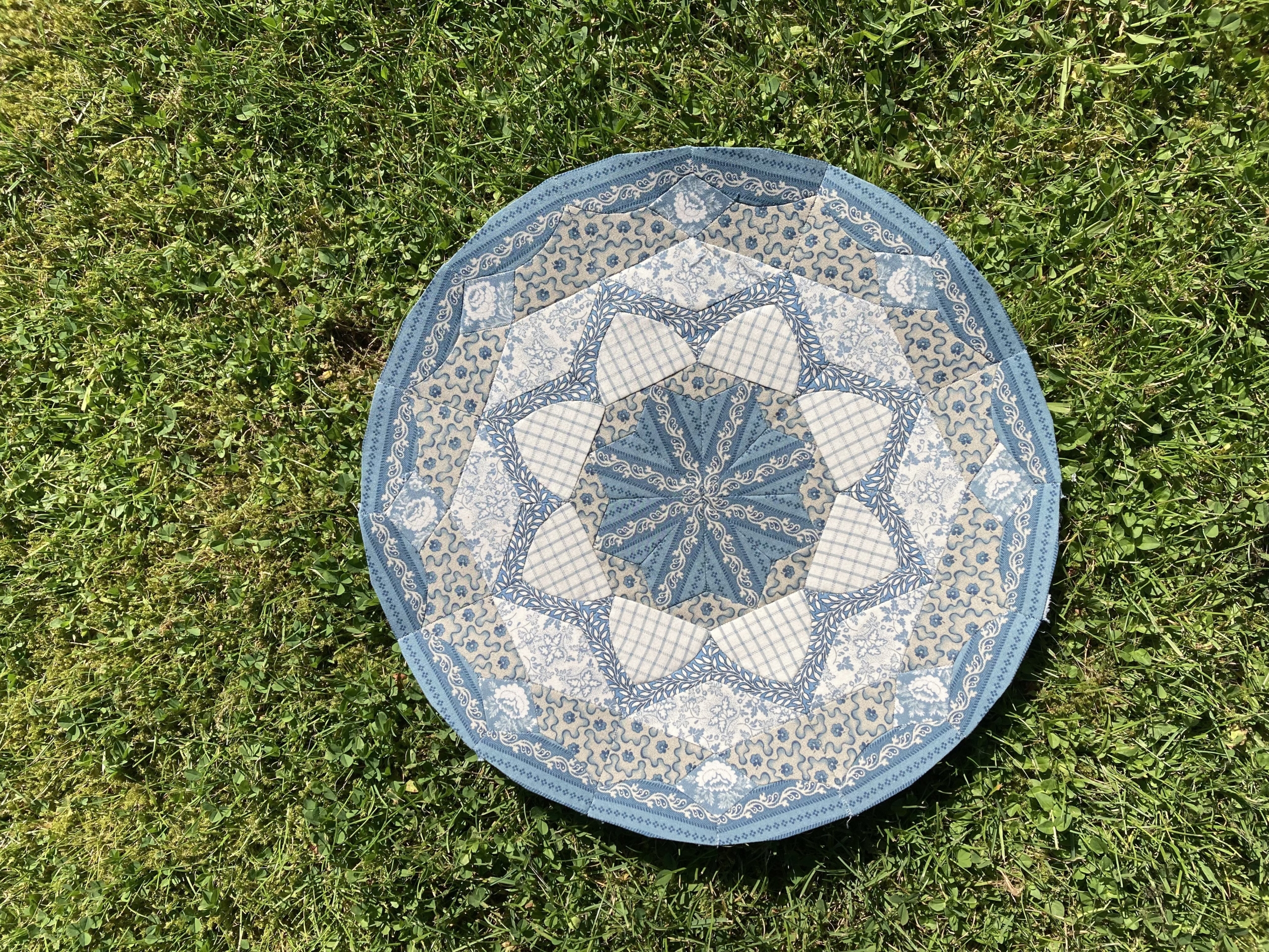 Ik wilde de plaatjes “de ster” laten zijn en niet zozeer het patroon. Daarom koos ik ervoor 10 pentagonnen aan elkaar te naaien, waardoor je dan een soort cirkel krijgt en die heb ik met de machine op de achtergrond geappliqueerd.