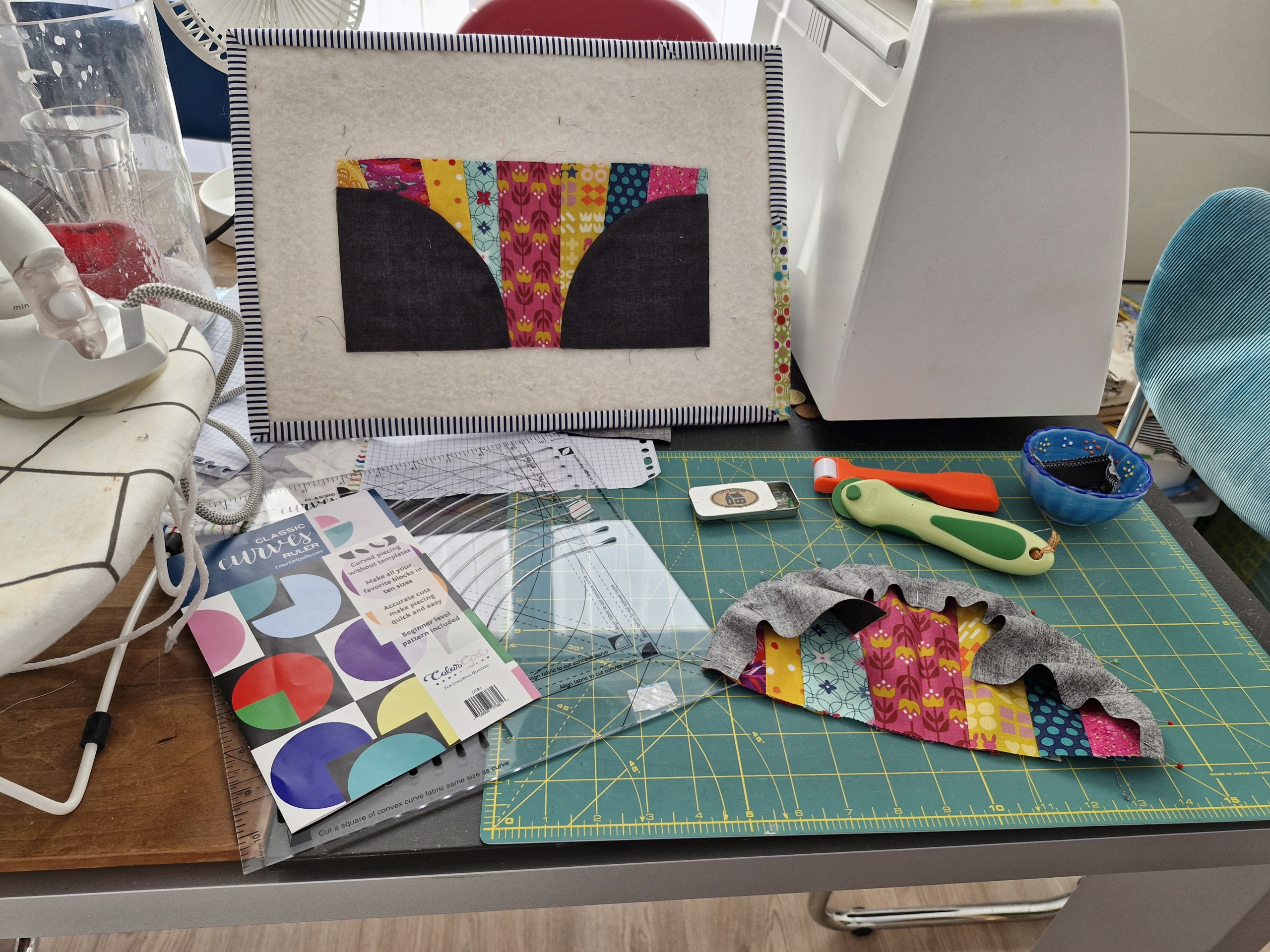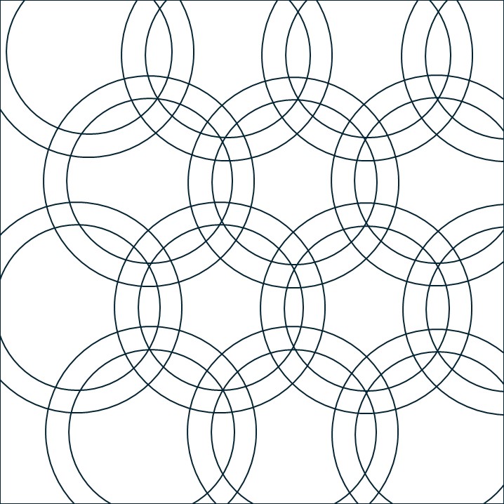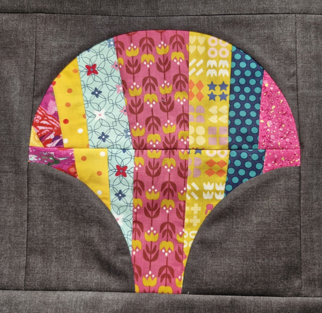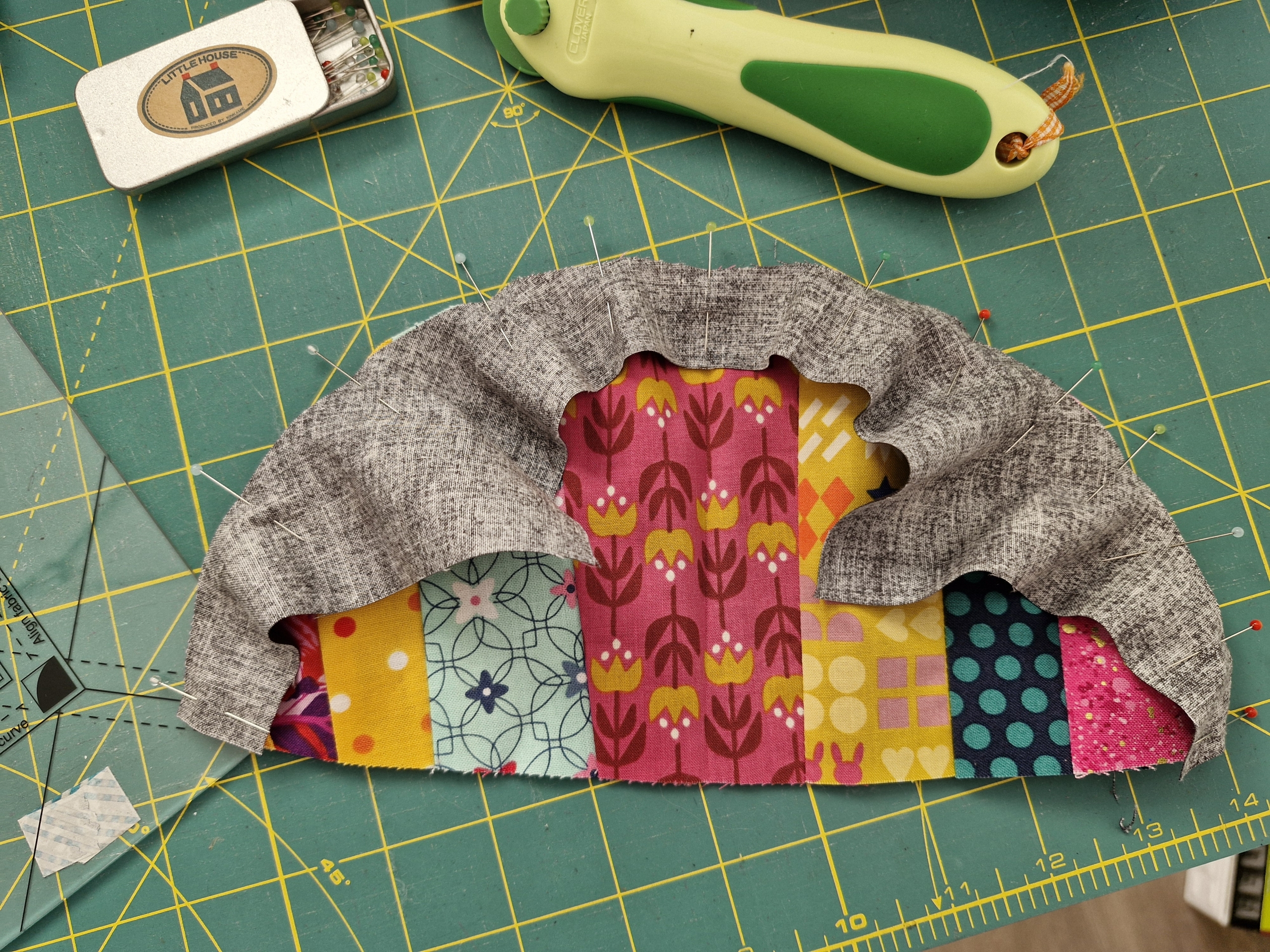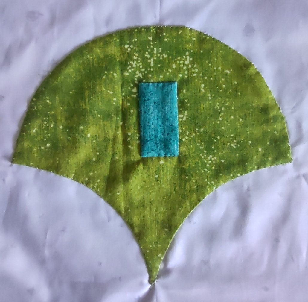 Ik wilde de plaatjes “de ster” laten zijn en niet zozeer het patroon. Daarom koos ik ervoor 10 pentagonnen aan elkaar te naaien, waardoor je dan een soort cirkel krijgt en die heb ik met de machine op de achtergrond geappliqueerd.