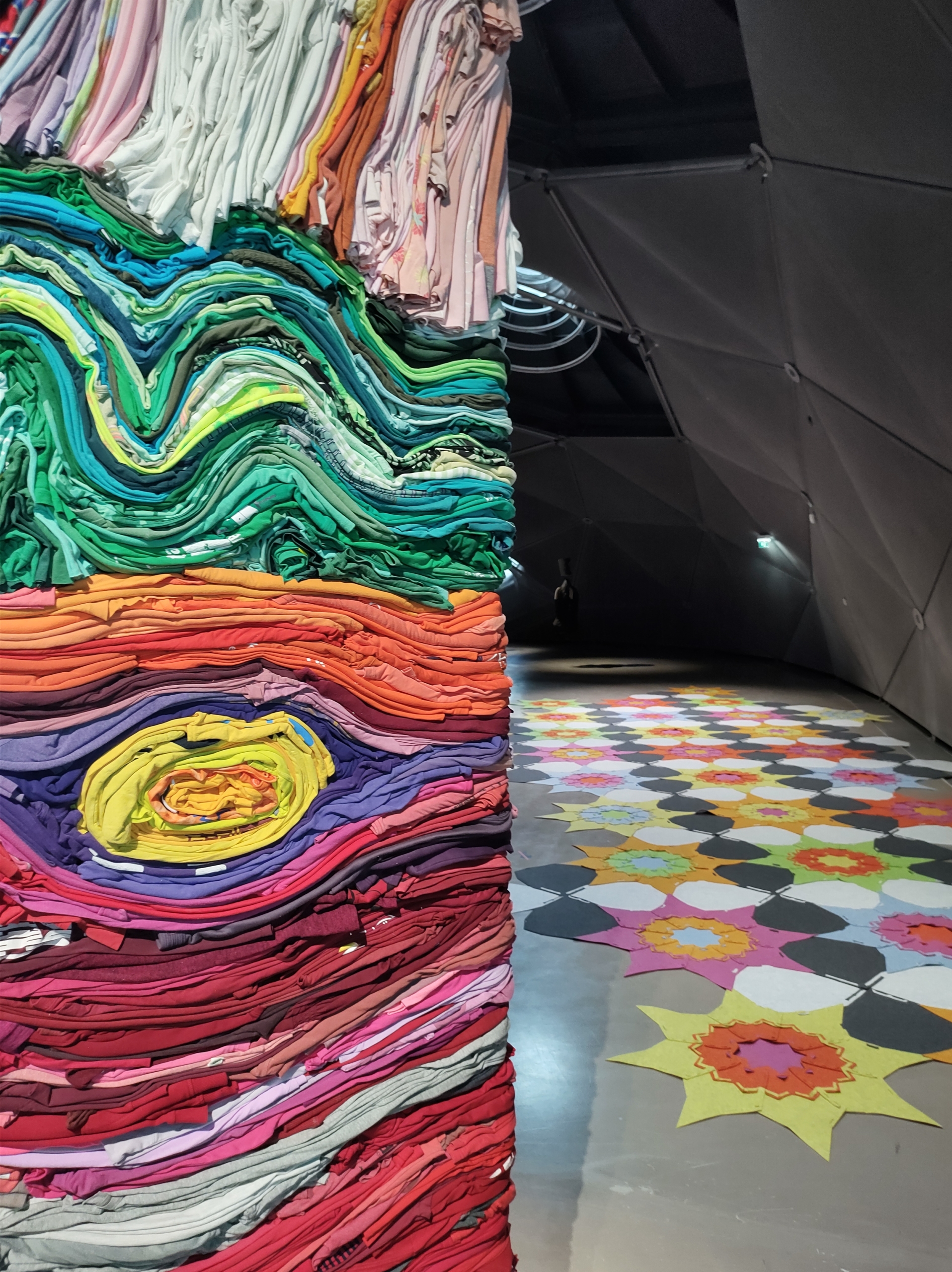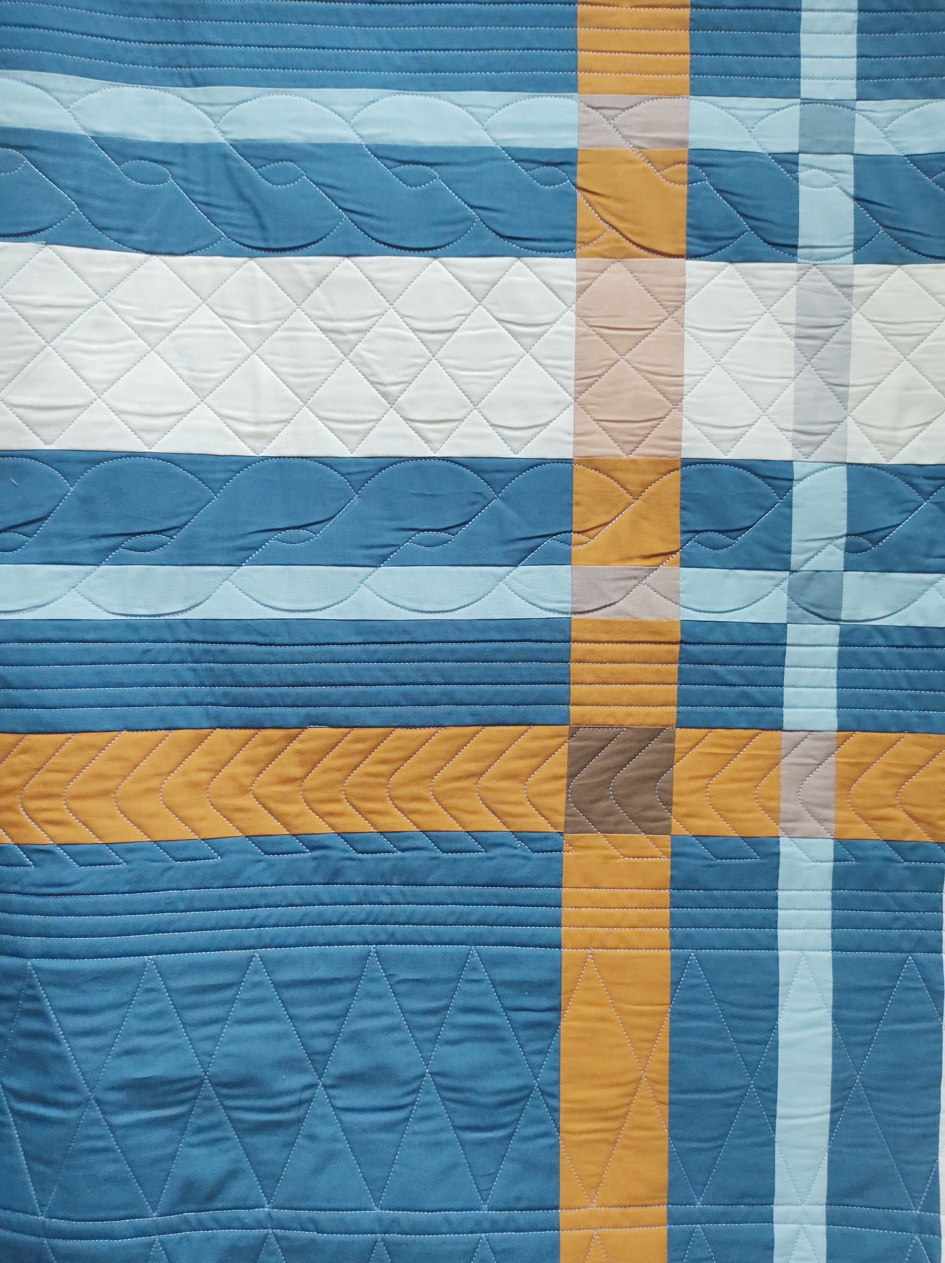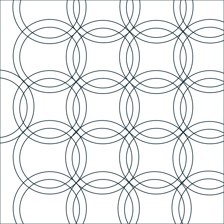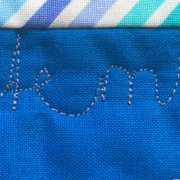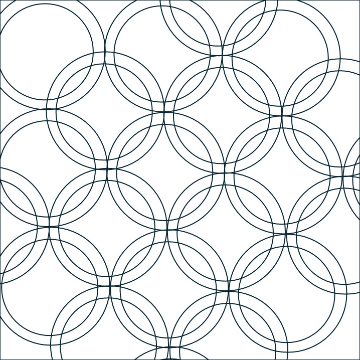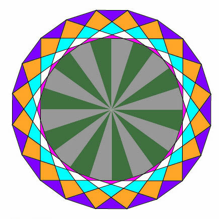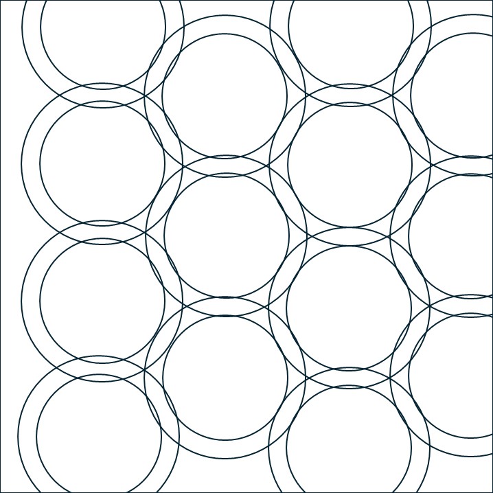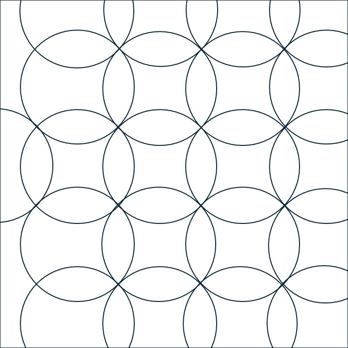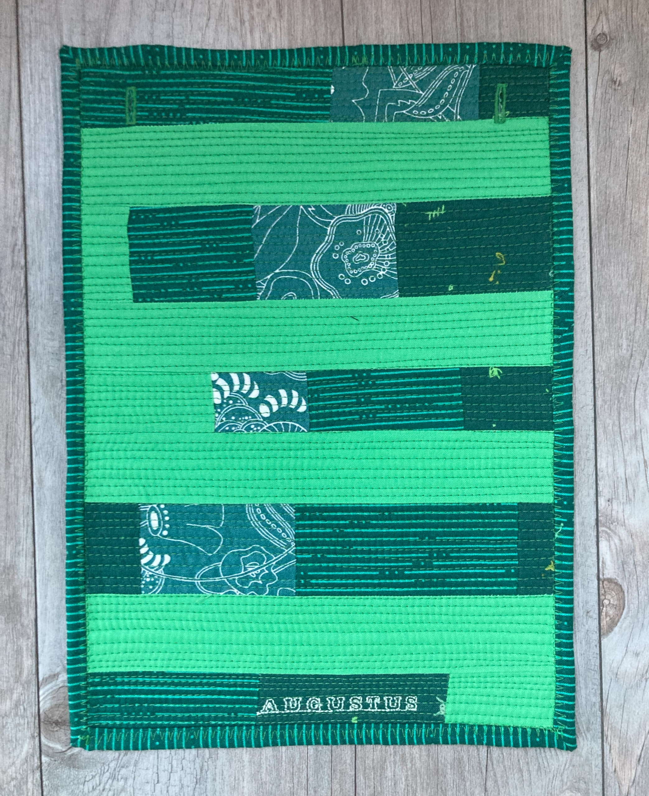 Ik wilde de plaatjes “de ster” laten zijn en niet zozeer het patroon. Daarom koos ik ervoor 10 pentagonnen aan elkaar te naaien, waardoor je dan een soort cirkel krijgt en die heb ik met de machine op de achtergrond geappliqueerd.