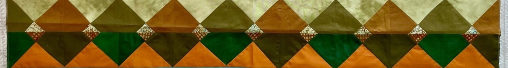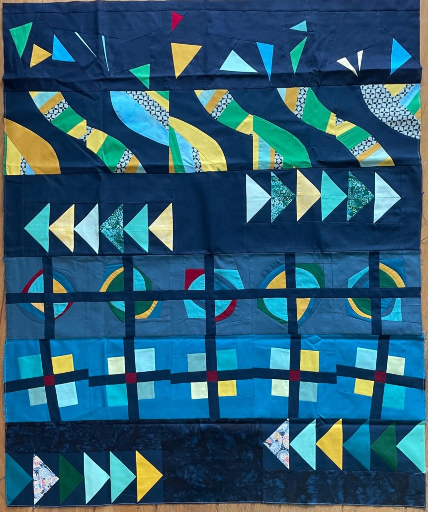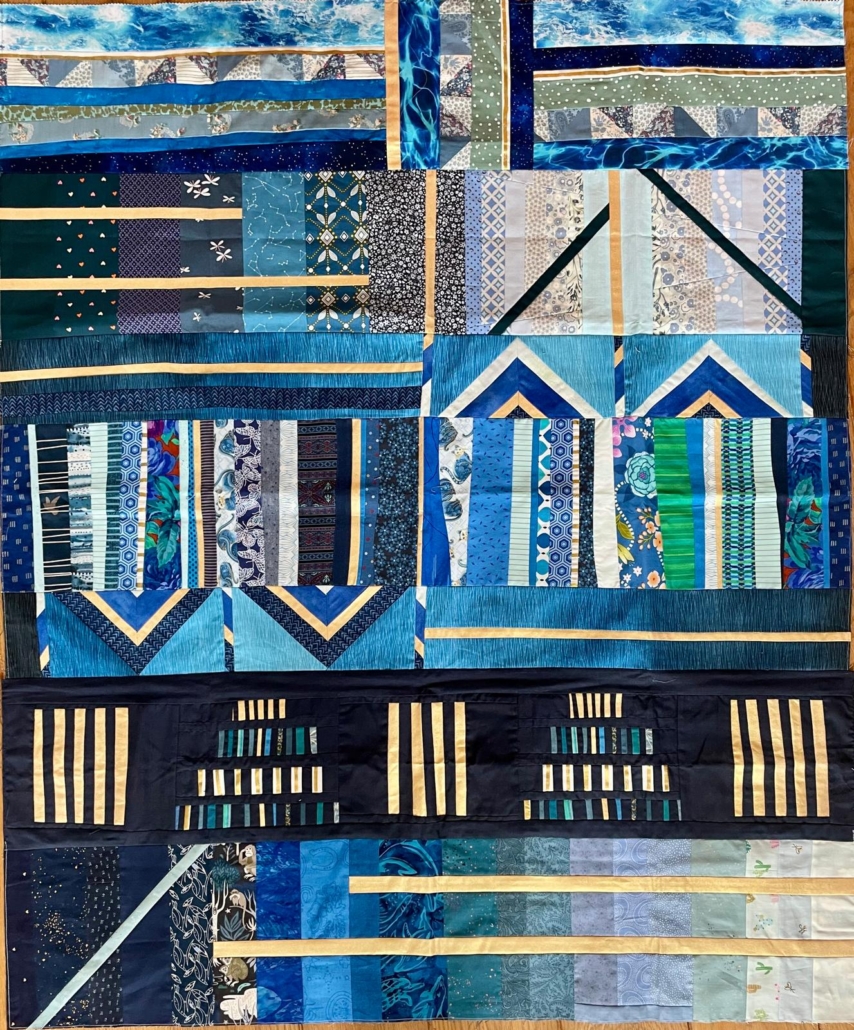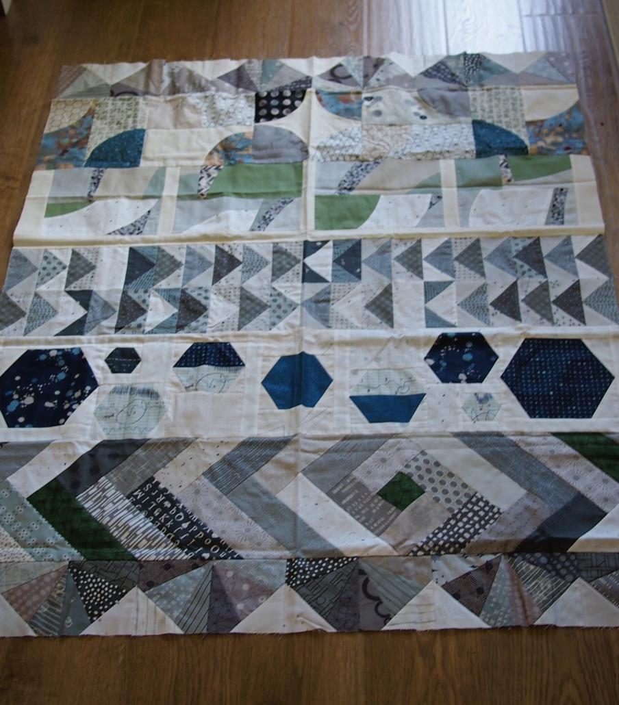 Tijdens het naaien kwam ik erachter dat ik mijn deel van de quilt niet allemaal aan één kant van de beginrij wilde naaien. Als ik alles op die manier neerlegde leek het voor mij alsof mijn werk niet zo veel te maken had met wat er al was. Er ontstond niet echt een geheel, maar het bleven duidelijk twee rijen gemaakt door verschillende mensen. Toen ik het door de Traverse quilt geïnspireerde stuk aan de andere kant plaatste, vond ik dat er veel meer een afgerond gevoel kwam en dat de quilt weer één werd. Zo heb ik het dus aanelkaar genaaid, 5” aan de ene kant en 3” aan de andere.