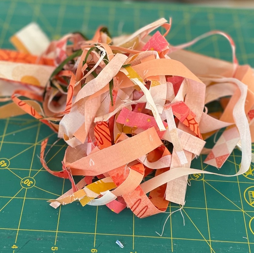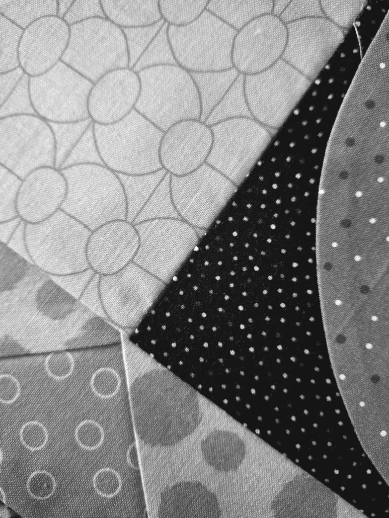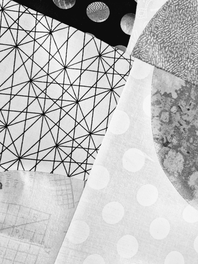 Hierna kwam de stofkeuze. Ik had niet dezelfde soort stof waarmee de beginrij was gemaakt, maar ik kon met sommige kleuren wel aansluiten bij wat er was. De beginrij was vrij donker, maar er zaten lichte stukjes in. Bij mijn toevoeging zijn de lichte stukken iets groter, maar ik heb low volume stoffen gebruikt om Gisèle’s voorkeur voor gedempte kleuren te volgen.