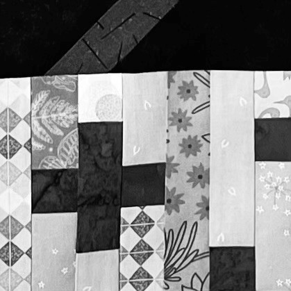 De improv techniek die Karla omschrijft is redelijk simpel volgens lijnen in een bepaalde richting een stapel stoffen tegelijkertijd snijden en dan van elk gesneden stapeltje steeds een stofje meer van voren naar achterop de stapel leggen. Op die manier heeft elke stapel een ander stofje voorop liggen. Ik nam een kleiner blok dan in het boek, maar het ging heel goed. En de vlechttechniek kwam heel mooi uit. Misschien een beetje cryptisch hier, maar misschien kan ik na de RoundRobin deze techniek nog eens in een boekbespreking-blog met het resultaat erbij laten zien…