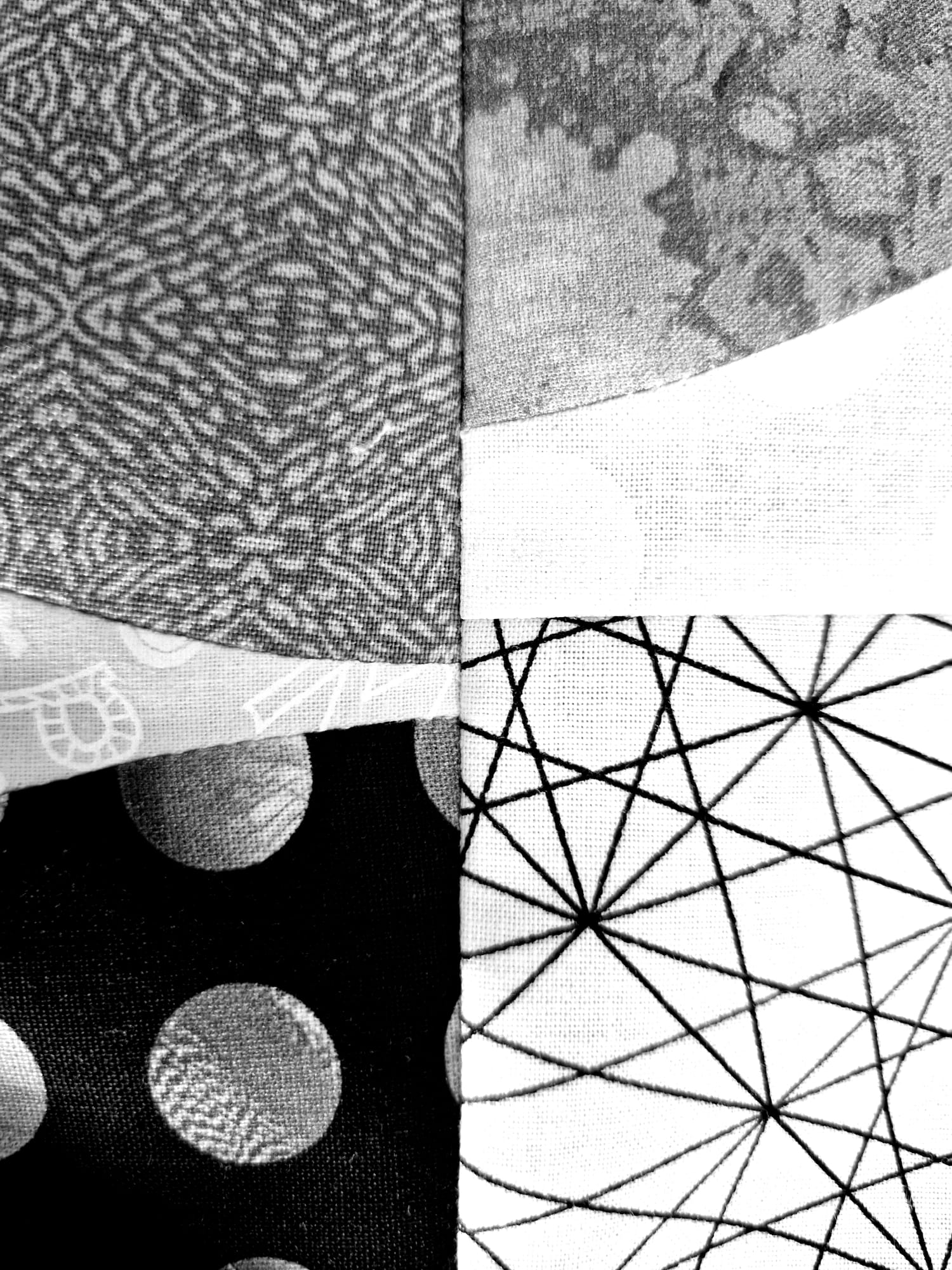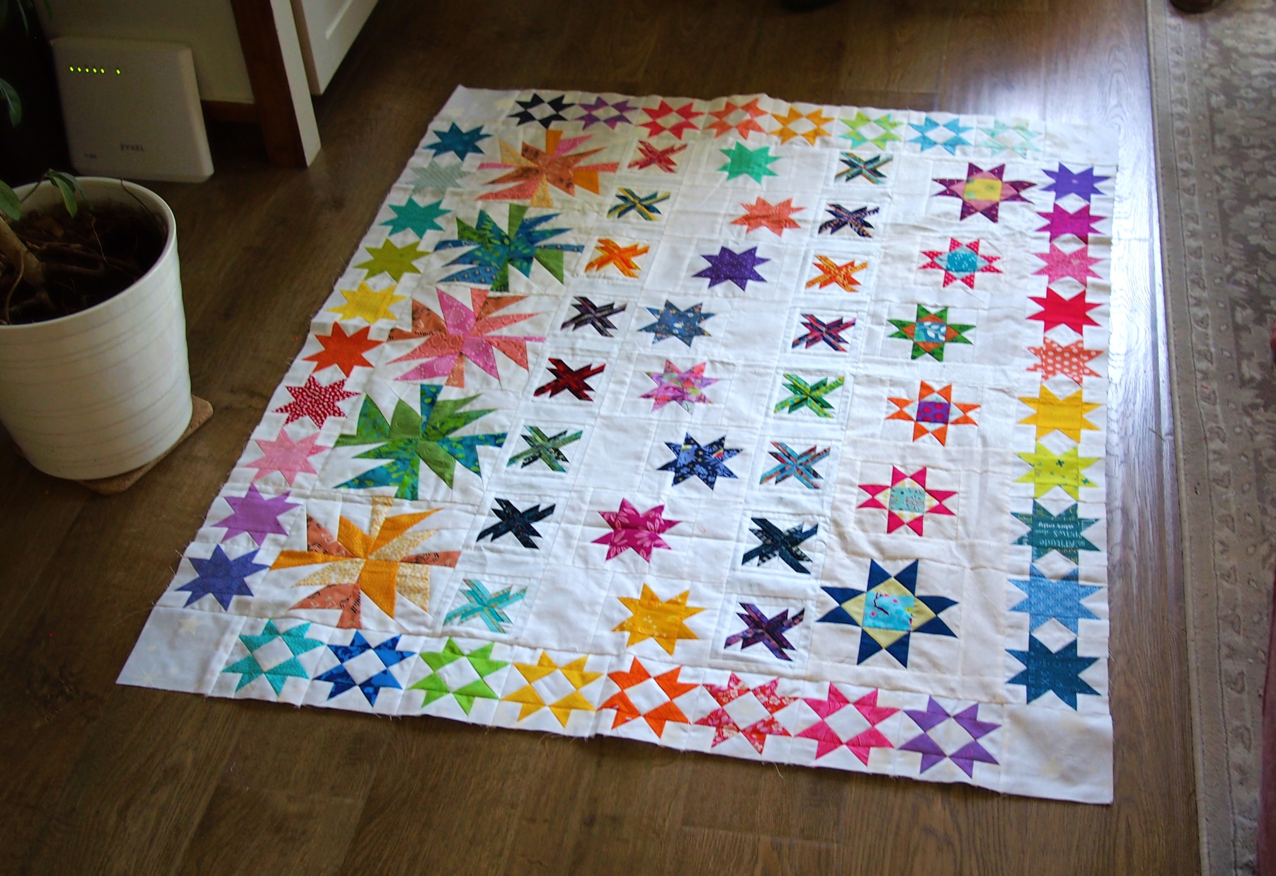 Ik zag in dat blok met een andere configuratie ook meteen een ster. Ik wist dat de RoundRobin van Elsbeth als thema sterren had… dus was dat even leuk! De blokken werden dan wel weer een stukje kleiner, want ineens moesten er twee naast elkaar. Tegen de tijd dat ronde 3 bij mij op de mat plofte, en ik het doosje openmaakte raakte ik een beetje in verwarring…. want er was wel erg veel wit in de startrij van Elsbeth – en de blokken uit het boek gingen uit van twee kleurgroepen. Daar heb ik wel even over zitten dubben: kon ik het wit overslaan en alleen vol kleur sterren maken? Hm. Na een paar dagen nadenken sloeg ik me plots voor mijn hoofd: ik kon wit (en gradaties) toch ook zien als een ‘kleur’? En zo paste het bedachte blok toch in de quilt….