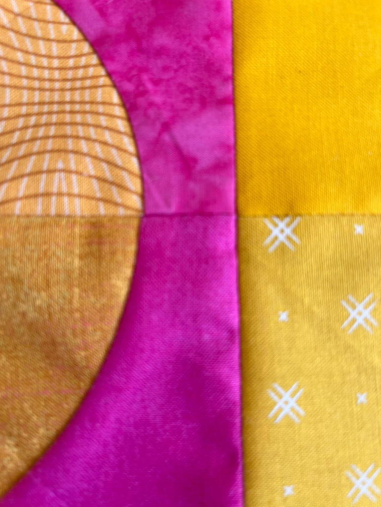 De prachtige quilt die voor ronde 5 binnenkwam, was al een kunstwerk. In het begin leek het een enorme uitdaging om te bedenken hoe ik aan dit stuk kon bijdragen! Het ontwerp bestond al uit veel elementen en was aan elke kant wat klein. De flexibiliteit en de mogelijkheid om in twee richtingen uit te breiden, bleken een voordeel. Ik kon aan een geïmproviseerd deel werken, dat vervolgens naar twee kanten overvloeide. Ik ben erg benieuwd naar de uiteindelijke versie van deze quilt, nadat het laatste deel is toegevoegd!