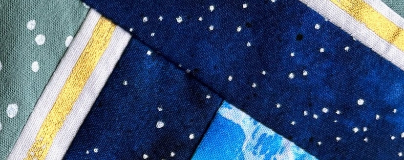 Ik was gevraagd om over ronde 4 te schrijven, maar ik heb daar uiteindelijk hetzelfde blok in andere vorm toegepast als ronde 3, dus ik begin het verhaal daar. De quilt waar ik in ronde 3 aan werkte wordt voor Molly. Molly had een hele doos vol met donkerblauw en oker batikstoffen meegestuurd dus dat was al een feestje om iets mee te gaan doen! Ik zoek altijd eerst naar overeenkomsten in de al gemaakte rijen en bij deze quilt viel het me op dat er steeds gebruik gemaakt werd van ‘vlechttechnieken’. Daarmee bedoel ik bijvoorbeeld een log cabin omdat je stroken om-en-om vanaf de ene en de andere kant naait. En juist op dat moment bood Marieke uit mijn Bee een paar boeken aan waaronder ‘Stack the Deck’ van Karla Alexander en daarin zag ik ineens inspiratie staan.