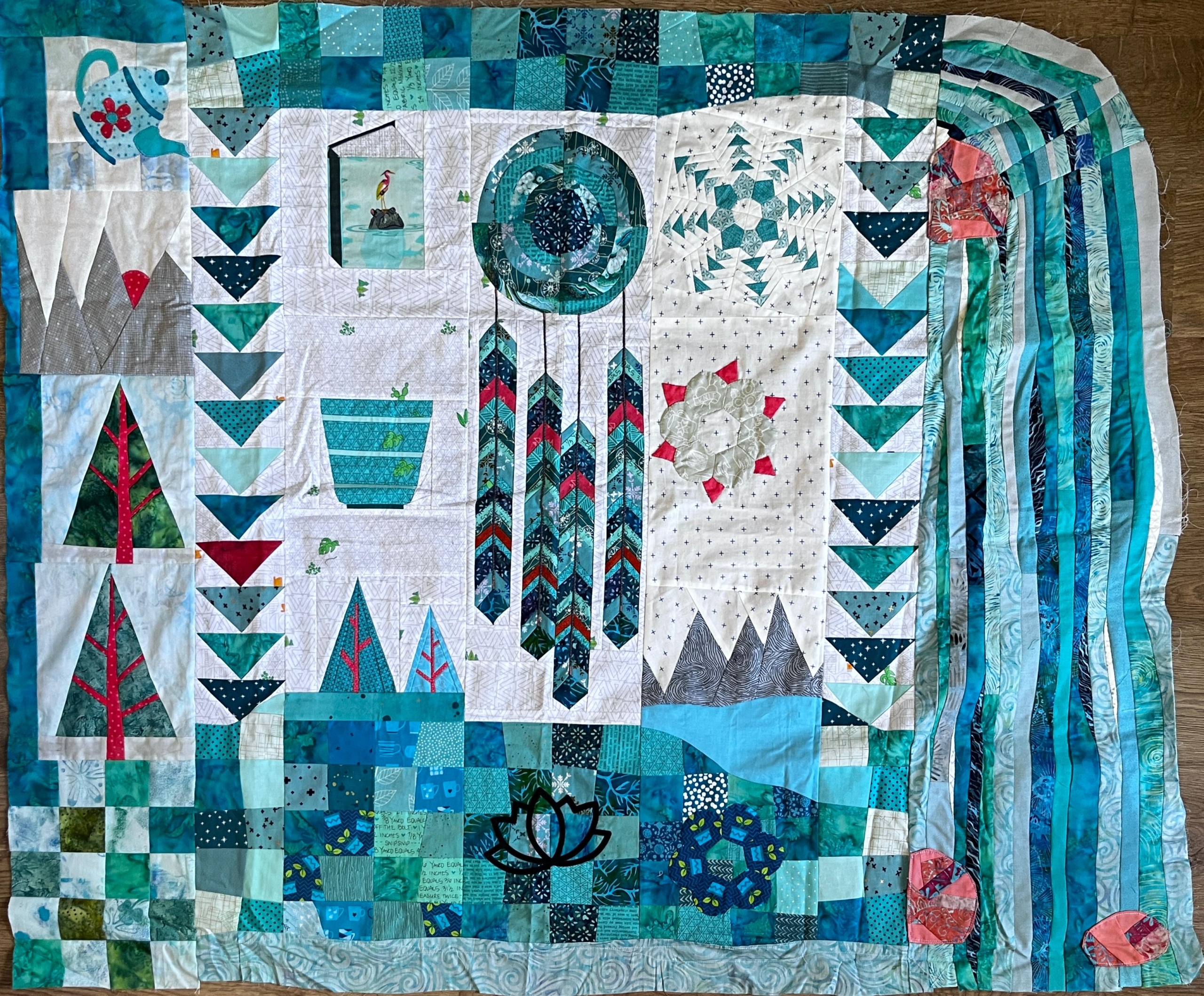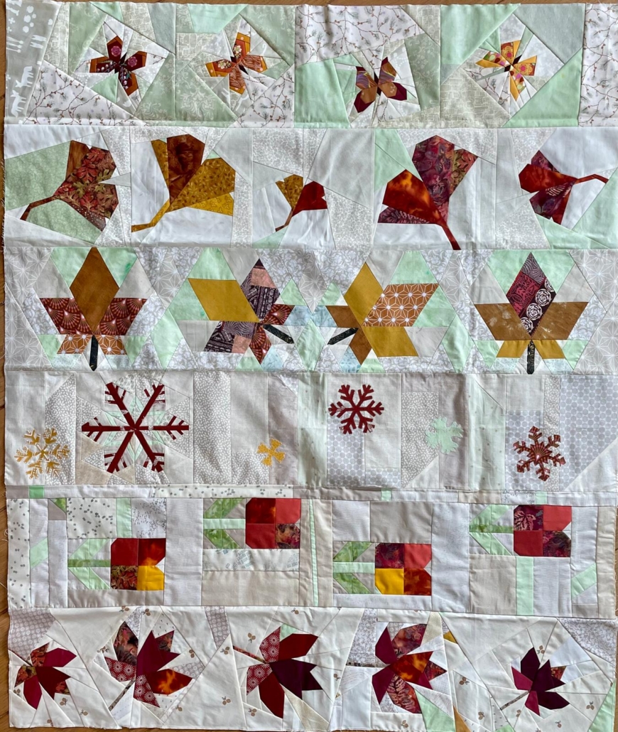 Nog even het proces op een rijtje: Er waren dit jaar 4 groepen van elk 5 quilters. Zij maakten allen een beginblok van 12″ en stuurden dat door naar de volgende in de groep, vaak vergezeld van een klein opschrijfboekje met toelichting, wat inspiratie of wensen. De volgende maakte er een volledige rand omheen van 6″ en stuurde weer door, ook het boekje verder aangevuld… een volledige rand van 4″ volgde en daarna nog twee keer een halve rand van 4″… Onderweg werden enkel sneak peeks gedeeld in onderlinge app-groepjes, dus als starter wist je echt niet wat voor quilt je uiteindelijk terug zou krijgen.