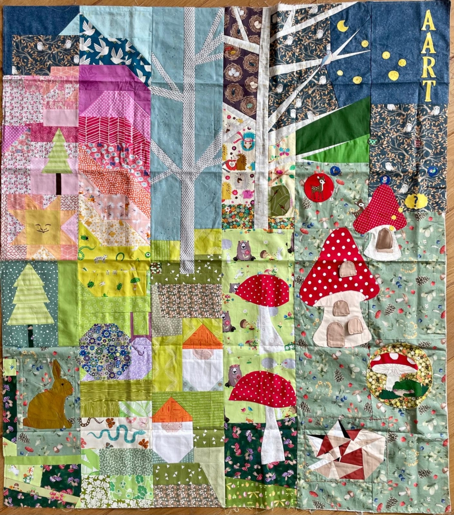 Inmiddels is mijn rij af en deze gaat vanmiddag samen met het boekje op de post. Ik moet het natuurlijk weer net iets anders doen en maak mijn rij verticaal in plaats van horizontaal. Mijn idee is een bos met beestjes en kabouters, voor op het bedje van mijn zoontje Aart die bijna 2 is. Met een beetje last-minute stress heb ik mijn rij af gekregen en ik ben er heel blij mee! Ik heb verschillende technieken gebruikt en ik ben heel benieuwd wat de quilters in mijn groepje ervan gaan maken. In de foto’s een kleine sneak peak!