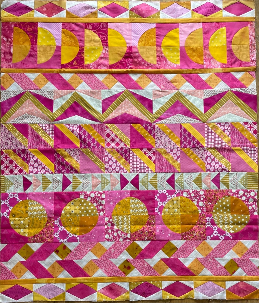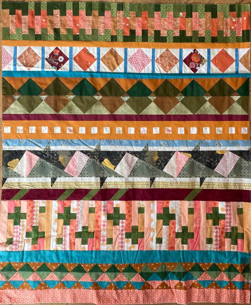 Wel heb ik een restjes sneakpeak voor de indruk van één van de kleuren (foto links). Voor het ontwerp van de blokken ben ik ook geïnspireerd door de quilt van Traverse Quilt van Tara Faugnan en door de rij van mijn voorganger Karen. Ik heb de nieuwe rij aan de andere kant van de inspiratie rij van Karen geplaatst om zo verbinding te maken dat het uiteindelijk één geheel wordt. In voorgaande rijen werd veel met blokjes en streepjes gewerkt dus daar heb ik ook een combi van gemaakt (foto rechts).