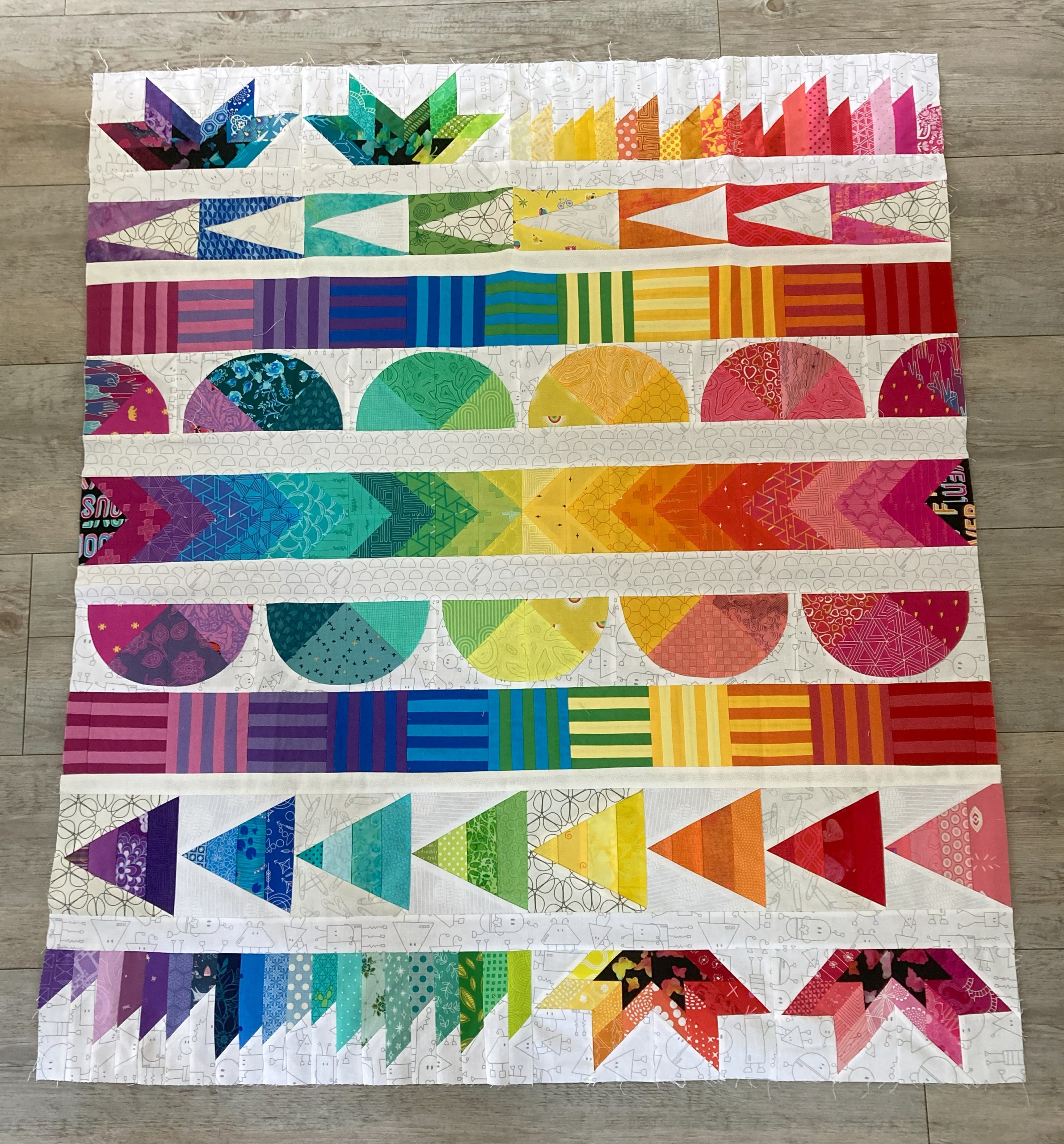 Veel nieuwe termen komen voorbij bij me, veel opzoekwerk. De Traverse quilt, Improv quilten, Low volumestoffen en zo gaat het maar door. Op internet vond ik een challenge om een improv-quilt te maken, van Julie Running Stitch, dat was een leuke kennismaking met deze manier van ontwerpen.