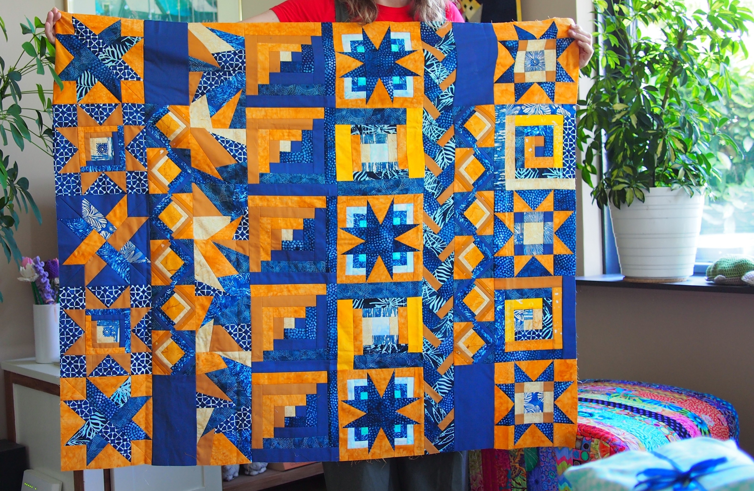 Het proces was heel spannend, dat doorwerken aan iets wat een ander maakte. Ieder zocht haar eigen vorm en dacht na over wat passend en aanvullend zou zijn: door op hetzelfde, versterken of juist wat contrast toevoegen? Vlak voor de zomer werd de laatste rand afgemaakt en gingen de quilts weer naar de maker van het beginblok… zouden ze het mooi vinden?! Is het wat ze wilden of verwachtten? In de appgroepen gingen de enthousiaste reacties over en weer.