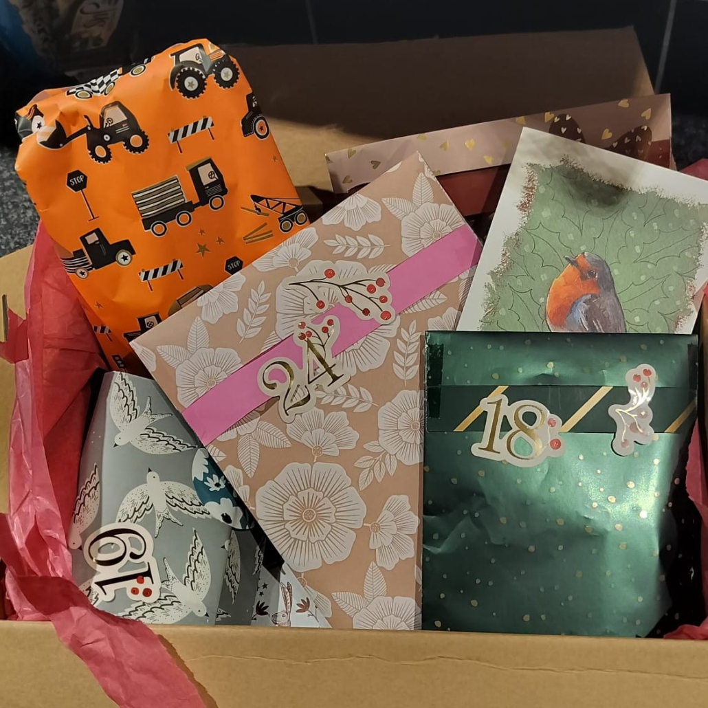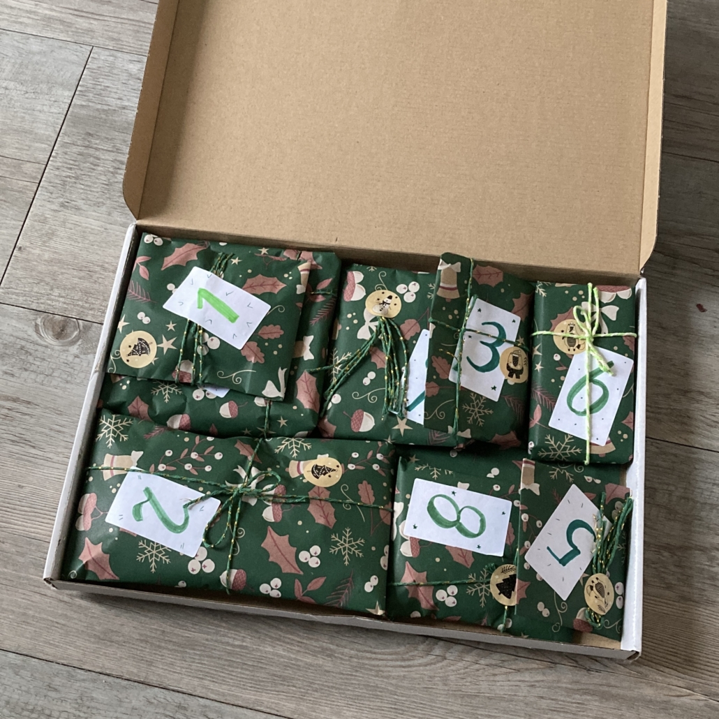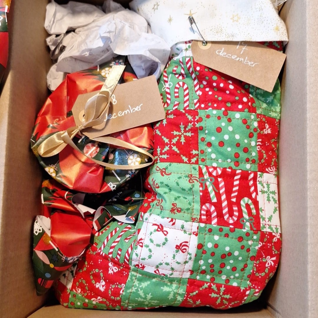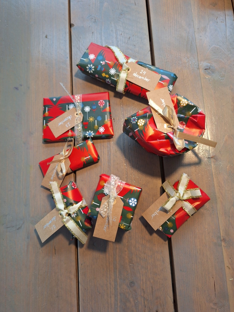 Wanneer je al je kadootjes hebt verzameld en gemaakt, hoef je ze alleen nog in te pakken en te nummeren. Zorg dat je duidelijk de pakjes van labels met nummers voorziet. Denk er ook aan dat ze er niet af vallen. Elsbeth schrijft ook de datum van het uitpakken op het label, dan is er geen twijfel mogelijk! Zorg ervoor dat je pakket een feest is om uit te pakken.
