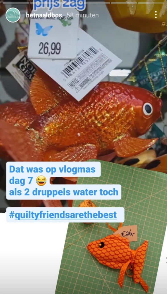 Wees niet bang om meer informatie over je swap maatje te vergaren. Heeft ze Instagram? Speur haar tijdlijn af. Zo heeft Karen ooit eens een goudvis kerstboom ornament voor Deveney gemaakt omdat dit toevallig in haar Instagram verhalen voorbij kwam. Super grappig en persoonlijk. Misschien zit je wel bij een bee en kun je hier meer informatie over je swap maatje los peuteren. Ook al weten je mede-quiltsters niets over je swap maatje, overleggen als je vast zit is altijd fijn.